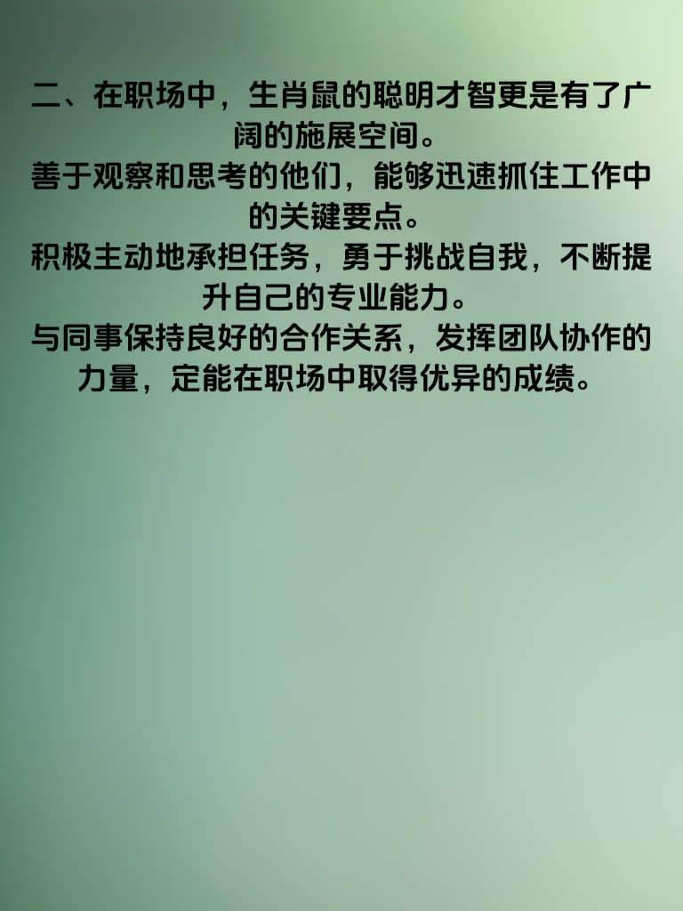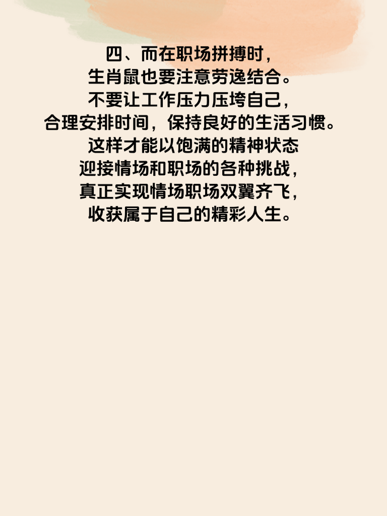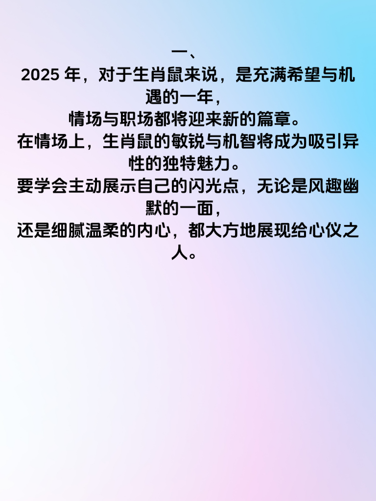 一、2025 年,对于生肖鼠来说,是充满希望与机遇的一年,情场与职场都将迎来新的篇章。在情场上,生肖鼠的敏锐与机智将成为吸引异性的独特魅力。要学会主动展示自己的闪光点,无论是风趣幽默的一面,还是细腻温柔的内心,都大方地展现给心仪之人。 二、在职场中,生肖鼠的聪明才智更是有了广阔的施展空间。善于观察和思考的他们,能够迅速抓住工作中的关键要点。积极主动地承担任务,勇于挑战自我,不断提升自己的专业能力。与同事保持良好的合作关系,发挥团队协作的力量,定能在职场中取得优异的成绩。 三、在追求爱情的道路上,生肖鼠要保持真诚与耐心。了解心仪女生的喜好和需求,用心去关怀她。适时地制造一些浪漫与惊喜,但不要过于刻意。用真心去打动她,让她感受到你的爱意与温暖。 四、而在职场拼搏时,生肖鼠也要注意劳逸结合。不要让工作压力压垮自己,合理安排时间,保持良好的生活习惯。这样才能以饱满的精神状态迎接情场和职场的各种挑战,真正实现情场职场双翼齐飞,收获属于自己的精彩人生。