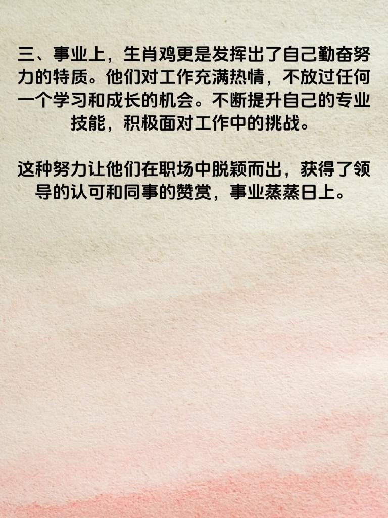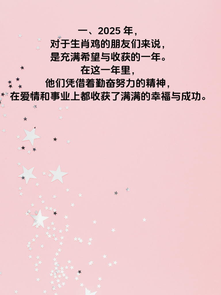 一、2025 年,对于生肖鸡的朋友们来说,是充满希望与收获的一年。在这一年里,他们凭借着勤奋努力的精神,在爱情和事业上都收获了满满的幸福与成功。 二、爱情中,生肖鸡的勤奋努力如同温暖的阳光,照亮了彼此前行的道路。他们用心经营感情,会在生活的点滴中给予对方关怀。精心准备的早餐,或是下班后一起漫步街头的温馨时光,都让感情愈发深厚。他们懂得付出,也善于倾听对方的心声,用真诚去打动爱人的心,从而收获甜蜜美满的爱情。 三、事业上,生肖鸡更是发挥出了自己勤奋努力的特质。他们对工作充满热情,不放过任何一个学习和成长的机会。不断提升自己的专业技能,积极面对工作中的挑战。这种努力让他们在职场中脱颖而出,获得了领导的认可和同事的赞赏,事业蒸蒸日上。 四、总之,2025 年生肖鸡用勤奋努力书写了爱情事业双美满的精彩篇章。他们的经历告诉我们,只要肯努力,就一定能收获属于自己的幸福与成就。
