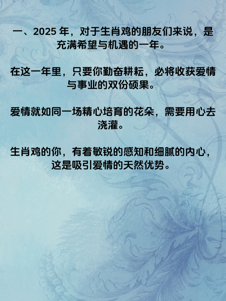 一、2025 年,对于生肖鸡的朋友们来说,是充满希望与机遇的一年。在这一年里,只要你勤奋耕耘,必将收获爱情与事业的双份硕果。爱情就如同一场精心培育的花朵,需要用心去浇灌。生肖鸡的你,有着敏锐的感知和细腻的内心,这是吸引爱情的天然优势。 二、在追求爱情的道路上,要积极主动地展现自己。勇敢地迈出第一步,去结识那个让你心动的人。用你的真诚和热情去打动对方,让对方感受到你对爱情的渴望。同时,事业也是生活中不可或缺的一部分。生肖鸡的你聪明伶俐,富有创造力,在工作中要充分发挥这些优点。 三、勤奋努力地工作,不断提升自己的能力。抓住每一个机会,勇于挑战自我。当你在事业上取得进步时,不仅能收获成就感,还会让自己更加自信和有魅力。而这种自信和魅力,也会在爱情中加分不少。相信在 2025 年,只要生肖鸡的你坚持不懈地勤奋耕耘,爱情的甜蜜与事业的成功都将属于你。