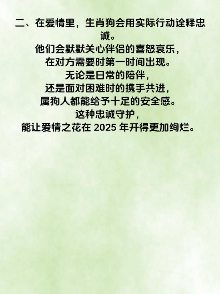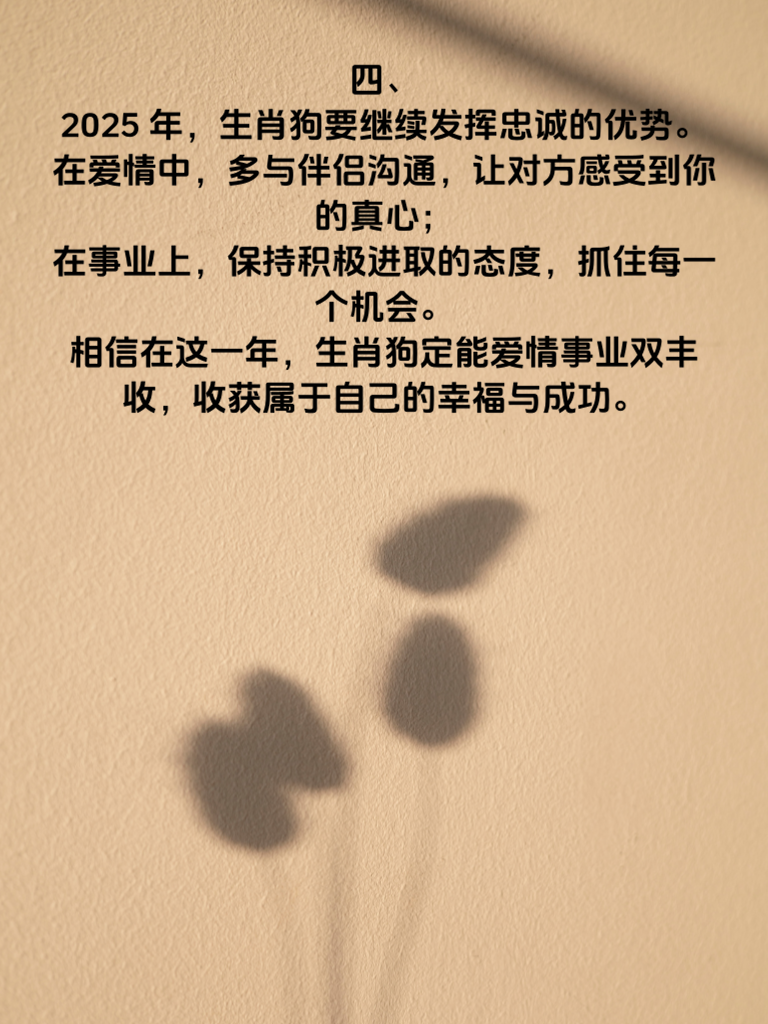 一、2025 年,生肖狗的朋友们在爱情与事业上有着独特的运势。生肖狗本就以忠诚著称,在这一年,他们的忠诚特质更是发挥到极致,成为守护爱情的坚固壁垒。对于有伴侣的属狗人来说,这一年是稳固感情的好时机。 二、在爱情里,生肖狗会用实际行动诠释忠诚。他们会默默关心伴侣的喜怒哀乐,在对方需要时第一时间出现。无论是日常的陪伴,还是面对困难时的携手共进,属狗人都能给予十足的安全感。这种忠诚守护,能让爱情之花在 2025 年开得更加绚烂。 三、事业方面,生肖狗凭借自身的努力和忠诚,也能收获诸多成果。他们对待工作认真负责,领导交代的任务总能出色完成。在团队中,属狗人的忠诚会赢得同事和领导的信任,为事业发展打下坚实基础。 四、2025 年,生肖狗要继续发挥忠诚的优势。在爱情中,多与伴侣沟通,让对方感受到你的真心;在事业上,保持积极进取的态度,抓住每一个机会。相信在这一年,生肖狗定能爱情事业双丰收,收获属于自己的幸福与成功。