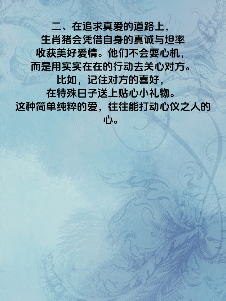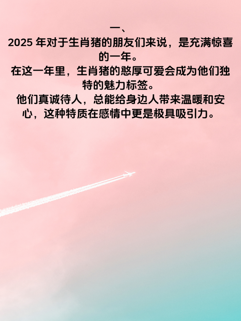 一、2025 年对于生肖猪的朋友们来说,是充满惊喜的一年。在这一年里,生肖猪的憨厚可爱会成为他们独特的魅力标签。他们真诚待人,总能给身边人带来温暖和安心,这种特质在感情中更是极具吸引力。 二、在追求真爱的道路上,生肖猪会凭借自身的真诚与坦率收获美好爱情。他们不会耍心机,而是用实实在在的行动去关心对方。比如,记住对方的喜好,在特殊日子送上贴心小礼物。这种简单纯粹的爱,往往能打动心仪之人的心。 三、事业方面,生肖猪在 2025 年也会有进步。他们踏实肯干的态度会得到领导认可。面对工作难题,不轻易退缩,努力钻研解决办法。凭借这种坚持不懈的精神,事业上会迎来新的机遇和发展。 四、总之,2025 年生肖猪无论是在爱情还是事业上,都有着独特的优势。只要保持那份憨厚可爱,继续真诚努力,定能收获满满的幸福与成就,赢得属于自己的精彩人生。