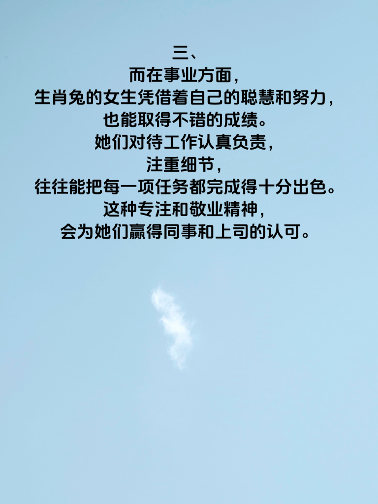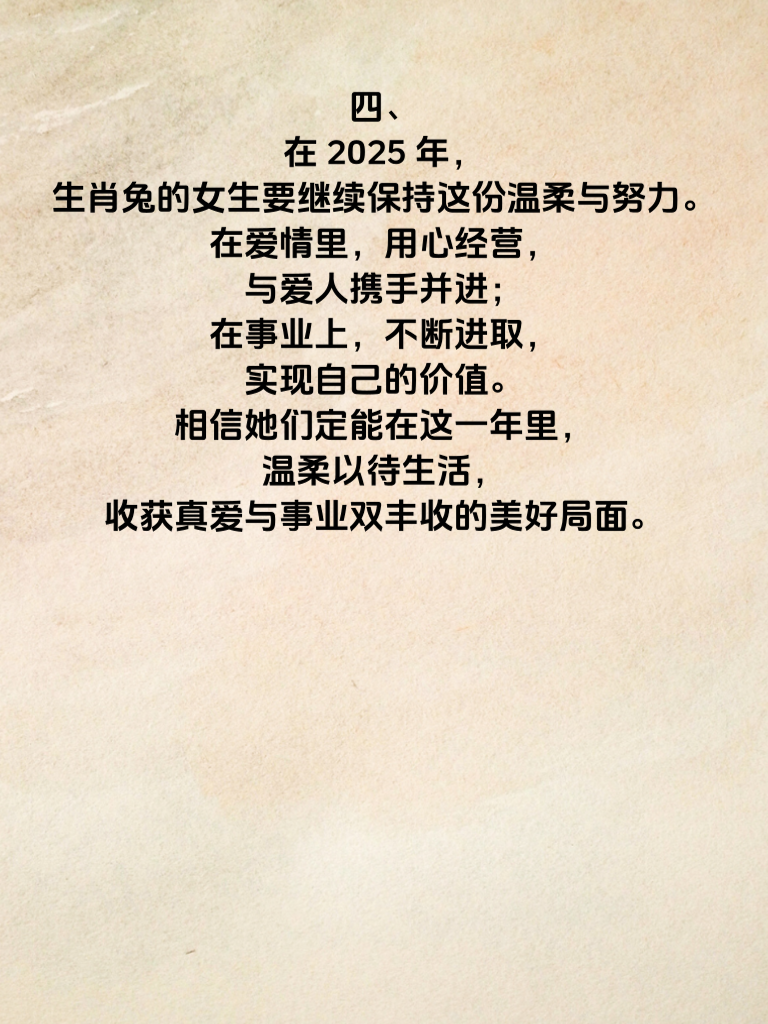 一、2025 年,对于生肖兔的女生来说,是充满美好期许的一年。在这一年里,她们将以温柔的姿态面对生活,收获满满的真爱与事业上的进步。 二、生肖兔的女生温柔似水,她们总能用细腻的情感去关怀身边的人。在追求真爱的道路上,这份温柔就是她们独特的魅力。她们会耐心倾听对方的想法,给予理解和支持,让对方在她们身边感受到无比的温暖与安心。 三、而在事业方面,生肖兔的女生凭借着自己的聪慧和努力,也能取得不错的成绩。她们对待工作认真负责,注重细节,往往能把每一项任务都完成得十分出色。这种专注和敬业精神,会为她们赢得同事和上司的认可。 四、在 2025 年,生肖兔的女生要继续保持这份温柔与努力。在爱情里,用心经营,与爱人携手并进;在事业上,不断进取,实现自己的价值。相信她们定能在这一年里,温柔以待生活,收获真爱与事业双丰收的美好局面。
