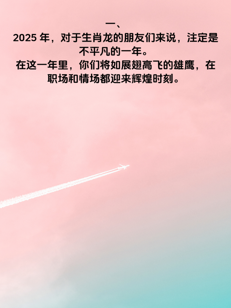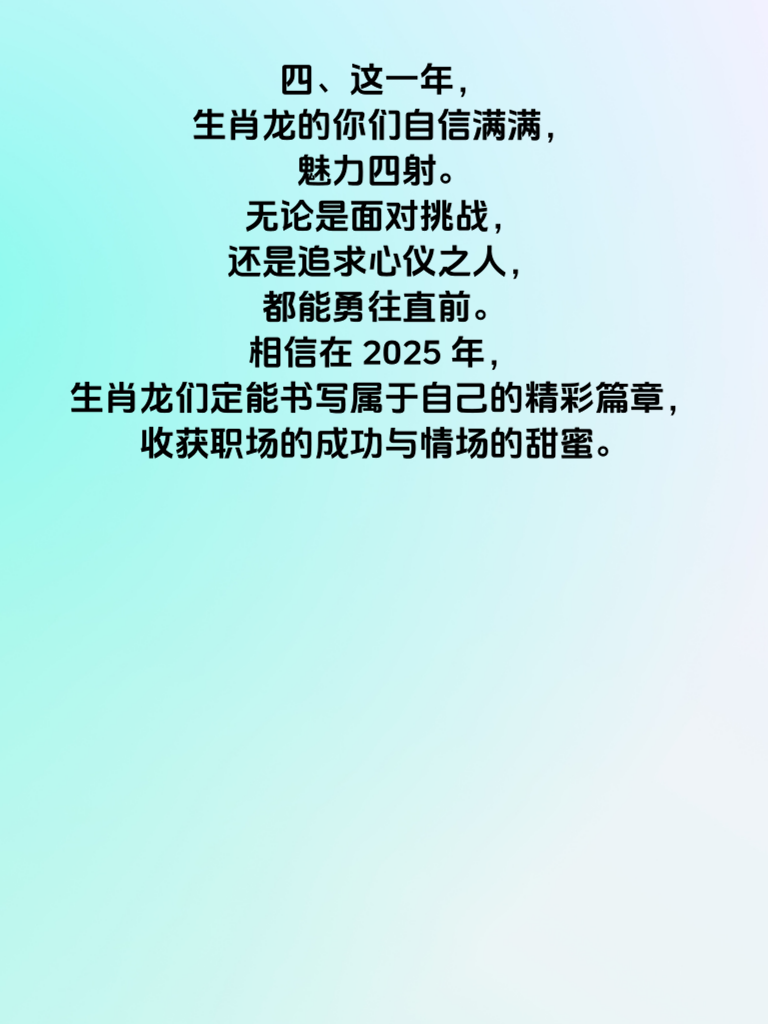 一、2025 年,对于生肖龙的朋友们来说,注定是不平凡的一年。在这一年里,你们将如展翅高飞的雄鹰,在职场和情场都迎来辉煌时刻。 二、职场上,生肖龙的敏锐洞察力和果断决策力将得到充分发挥。你们能迅速捕捉到机遇,凭借卓越的智慧和勇气,攻克一个又一个难题,事业节节攀升。 三、而在情场中,生肖龙的热情与真诚也会吸引众多目光。你们懂得用心去经营感情,尊重对方的同时也坚守自我。会用独特的方式表达爱意,让伴侣感受到满满的幸福。 四、这一年,生肖龙的你们自信满满,魅力四射。无论是面对挑战还是追求心仪之人,都能勇往直前。相信在 2025 年,生肖龙们定能书写属于自己的精彩篇章,收获职场的成功与情场的甜蜜。