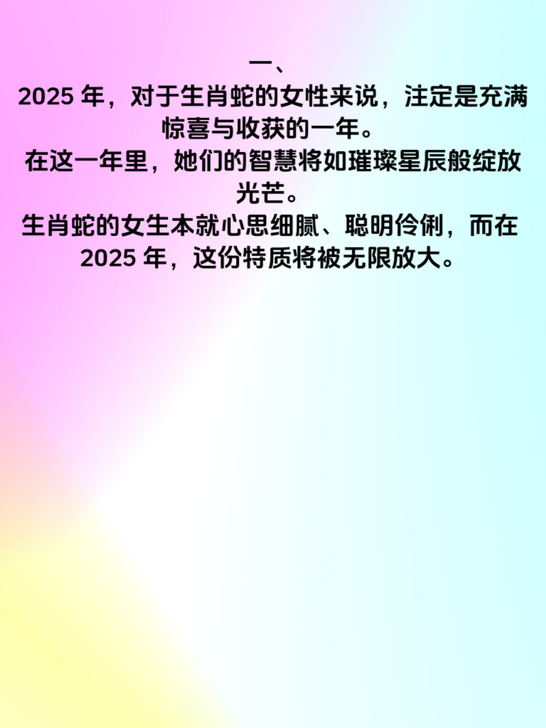 一、2025年,对于生肖蛇的女性来说,注定是充满惊喜与收获的一年。在这一年里,她们的智慧将如璀璨星辰般绽放光芒。生肖蛇的女生本就心思细腻、聪明伶俐,而在2025年,这份特质将被无限放大。 二、在爱情方面,智慧的她们更懂得如何经营感情。她们会用敏锐的洞察力去感知伴侣的需求,以温柔且智慧的方式沟通交流,化解矛盾。与伴侣相处时,能巧妙地展现自身魅力,让爱情愈发甜蜜稳固。 三、事业上,生肖蛇女凭借着卓越的智慧和坚定的执行力,能够精准把握机遇。她们冷静分析问题,做出明智决策,在职场中如鱼得水,收获满满的成就感。爱情事业双得意的2025年,生肖蛇女将书写属于自己的精彩篇章,绽放独特魅力,吸引着身边的一切美好围绕。
