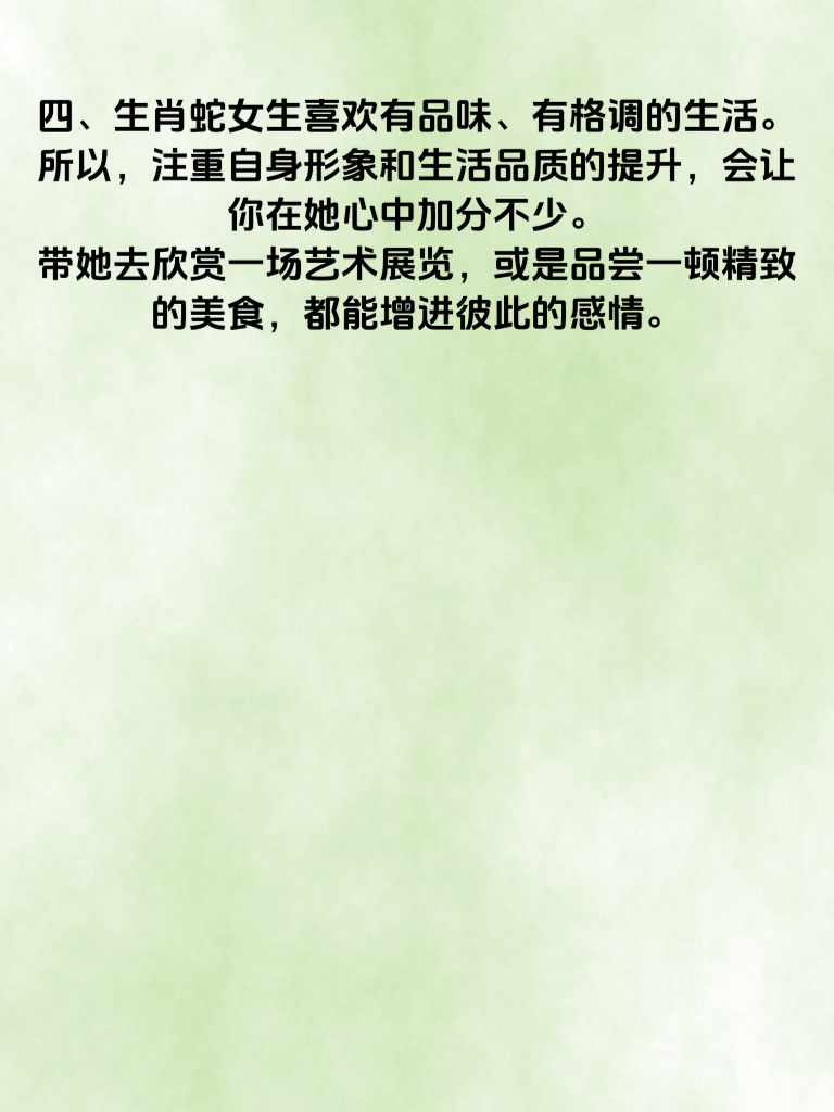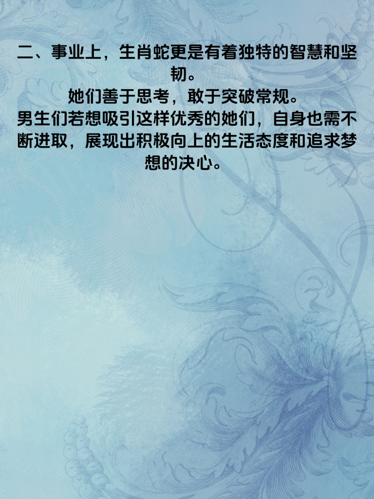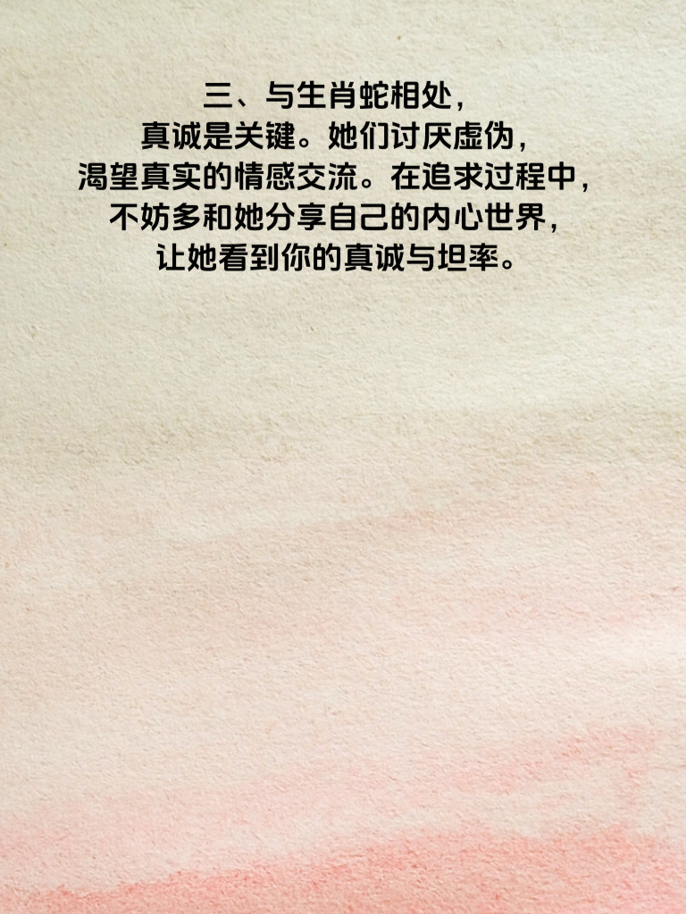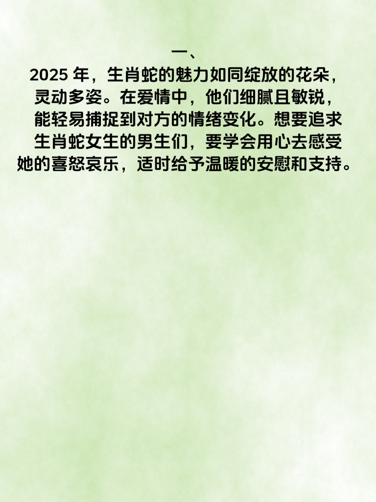 一、2025年,生肖蛇的魅力如同绽放的花朵,灵动多姿。在爱情中,他们细腻且敏锐,能轻易捕捉到对方的情绪变化。想要追求生肖蛇女生的男生们,要学会用心去感受她的喜怒哀乐,适时给予温暖的安慰和支持。 二、事业上,生肖蛇更是有着独特的智慧和坚韧。她们善于思考,敢于突破常规。男生们若想吸引这样优秀的她们,自身也需不断进取,展现出积极向上的生活态度和追求梦想的决心。 三、与生肖蛇相处,真诚是关键。她们讨厌虚伪,渴望真实的情感交流。在追求过程中,不妨多和她分享自己的内心世界,让她看到你的真诚与坦率。 四、生肖蛇女生喜欢有品味、有格调的生活。所以,注重自身形象和生活品质的提升,会让你在她心中加分不少。带她去欣赏一场艺术展览,或是品尝一顿精致的美食,都能增进彼此的感情。 五、2025年的生肖蛇,爱情事业双得意。只要你掌握正确的追求技巧,用心去呵护这段感情,就能与她携手走过美好的时光,共同书写属于你们的幸福篇章。