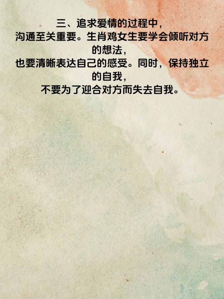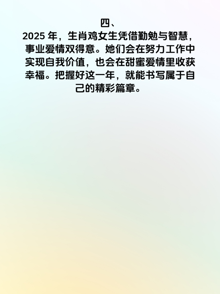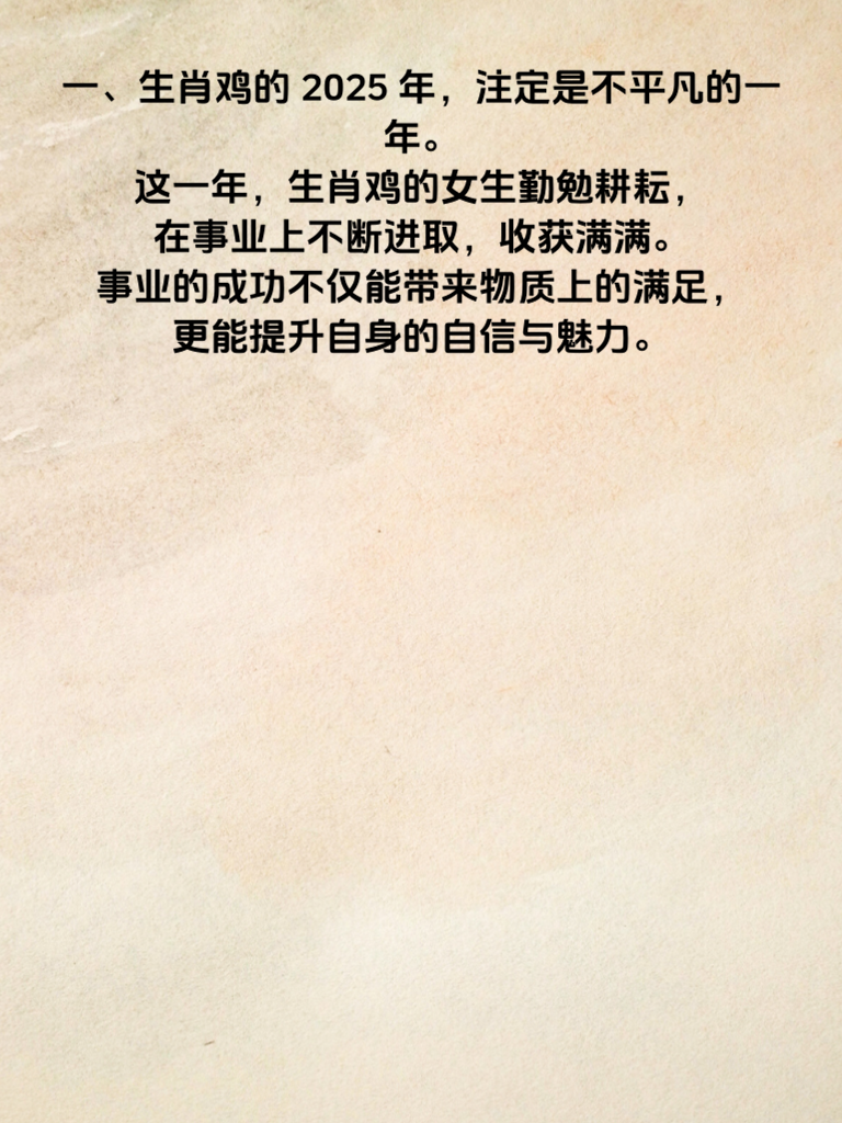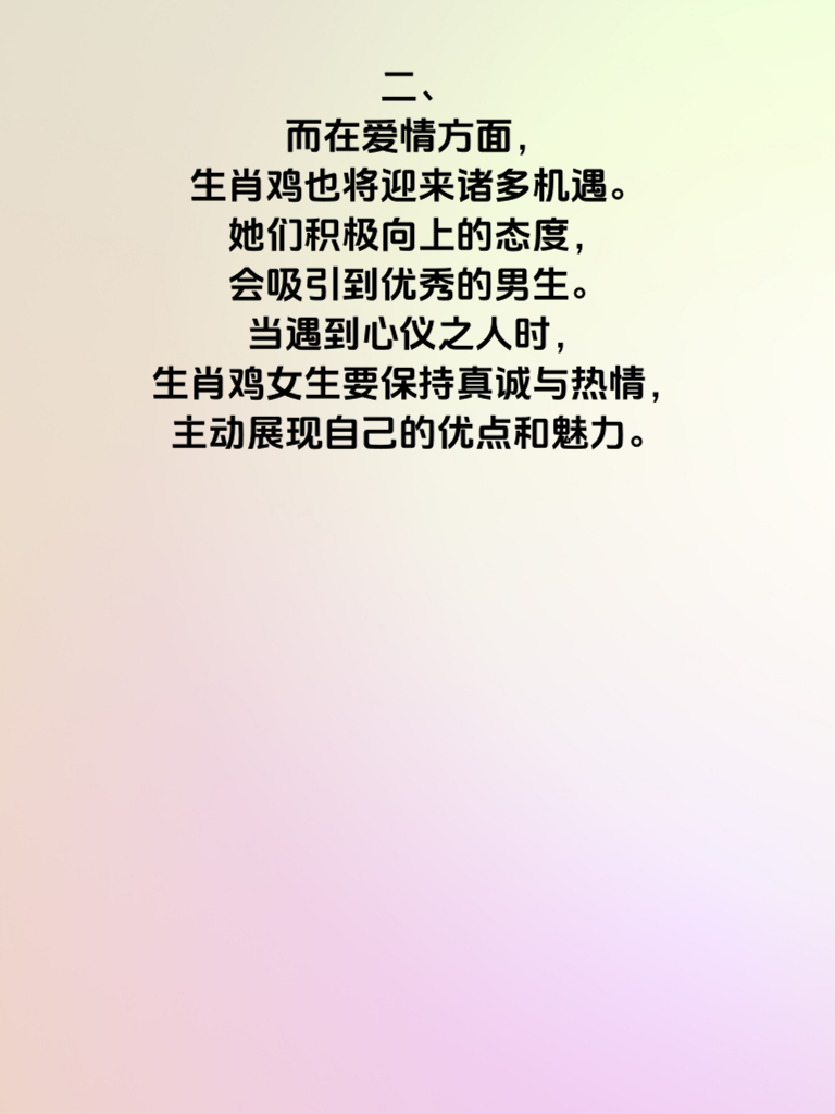 一、生肖鸡的2025年,注定是不平凡的一年。这一年,生肖鸡的女生勤勉耕耘,在事业上不断进取,收获满满。事业的成功不仅能带来物质上的满足,更能提升自身的自信与魅力。 二、而在爱情方面,生肖鸡也将迎来诸多机遇。她们积极向上的态度会吸引到优秀的男生。当遇到心仪之人时,生肖鸡女生要保持真诚与热情,主动展现自己的优点和魅力。 三、追求爱情的过程中,沟通至关重要。生肖鸡女生要学会倾听对方的想法,也要清晰表达自己的感受。同时,保持独立的自我,不要为了迎合对方而失去自我。 四、2025年,生肖鸡女生凭借勤勉与智慧,事业爱情双得意。她们会在努力工作中实现自我价值,也会在甜蜜爱情里收获幸福。把握好这一年,就能书写属于自己的精彩篇章。
