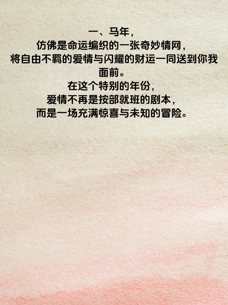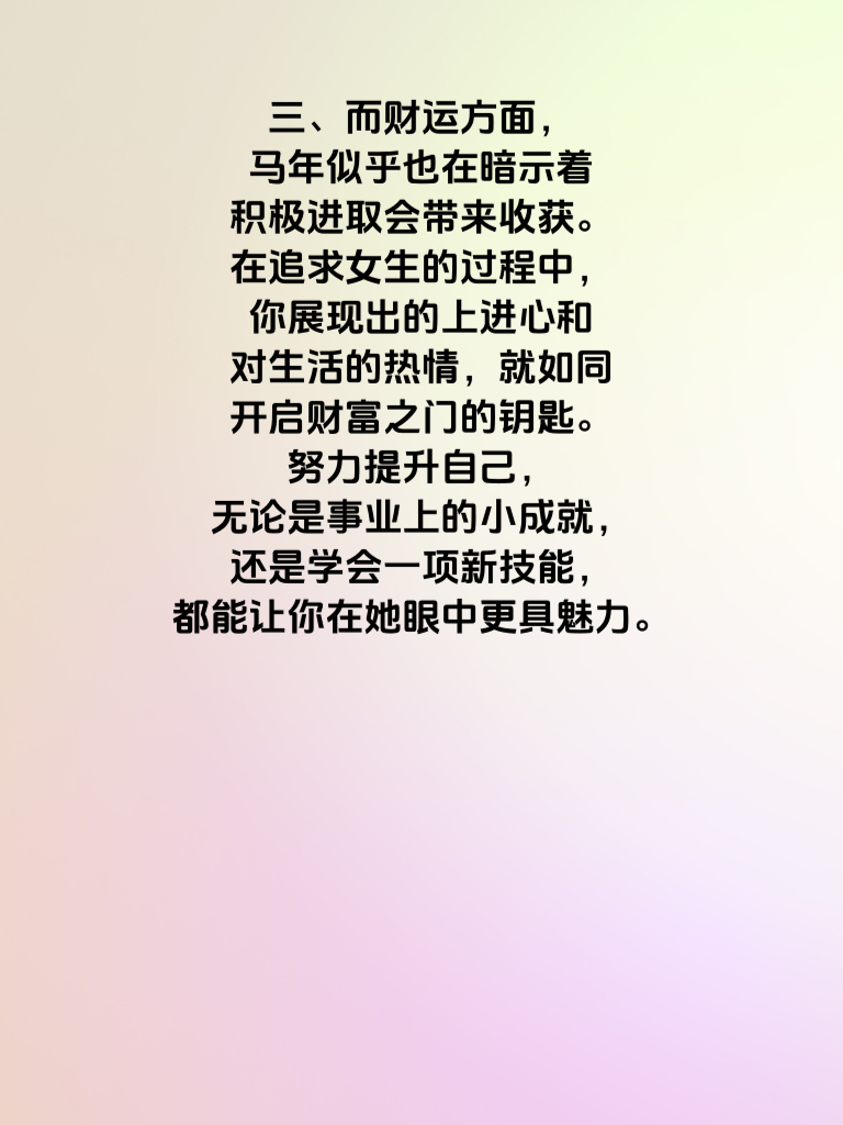 一、马年,仿佛是命运编织的一张奇妙情网,将自由不羁的爱情与闪耀的财运一同送到你我面前。在这个特别的年份,爱情不再是按部就班的剧本,而是一场充满惊喜与未知的冒险。 二、对于追求爱情的男生来说,要懂得欣赏女生对自由的向往。别试图用过多的束缚去捆绑她,而是像一阵温柔的风,与她一起在自由的天空下翱翔。比如,她想去看一场说走就走的旅行,那就陪她规划路线,准备行囊,一起踏上那未知的旅途,在旅途中分享彼此的喜怒哀乐,增进感情。 三、而财运方面,马年似乎也在暗示着积极进取会带来收获。在追求女生的过程中,你展现出的上进心和对生活的热情,就如同开启财富之门的钥匙。努力提升自己,无论是事业上的小成就,还是学会一项新技能,都能让你在她眼中更具魅力。 四、马年情缘,是自由与责任的完美融合。用自由的爱去温暖她,用努力的姿态去吸引她,让爱情与财运在这一年熠熠生辉,共同书写属于你们的精彩故事。