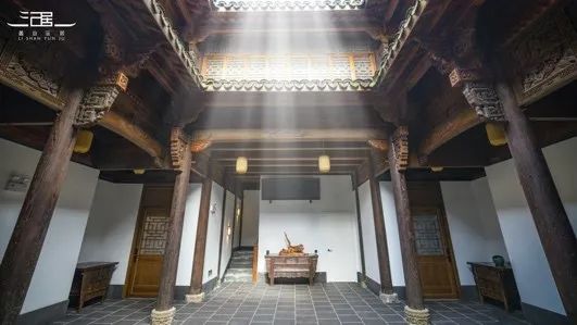 度假区主打的是复原和大隐隐于市。内部有已复建徽派古民居十三栋,外观粉墙黛瓦,天井保持着原建筑的古朴。