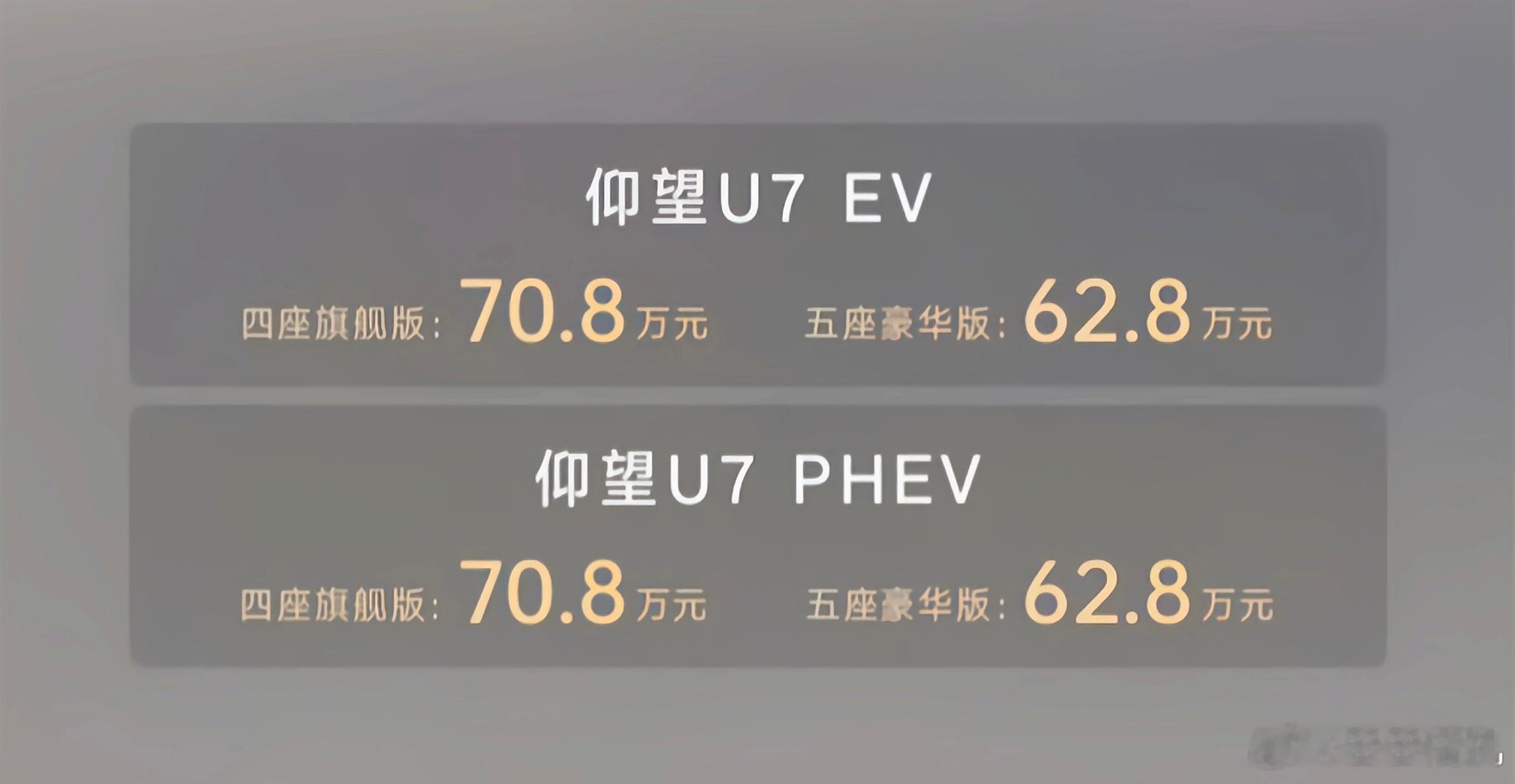 仰望U7正式上市,PHEV和EV同价,五座豪华版售价62.8万元,四座旗舰版售价70.8万元……更多信息如图所示,你觉得这价格香不香?[笑而不语]仰望U7上市