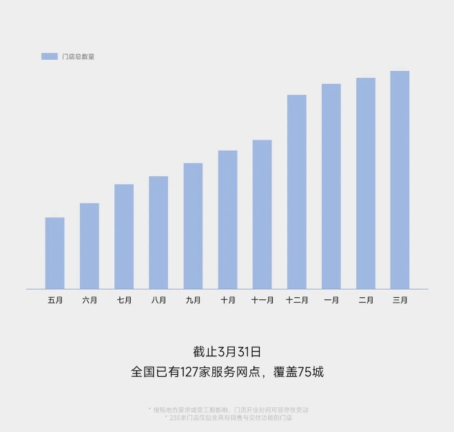 3月新增15家门店,全国65城已有235家门店;截止3月31日,全国已有127家服务网点,覆盖全国75城。