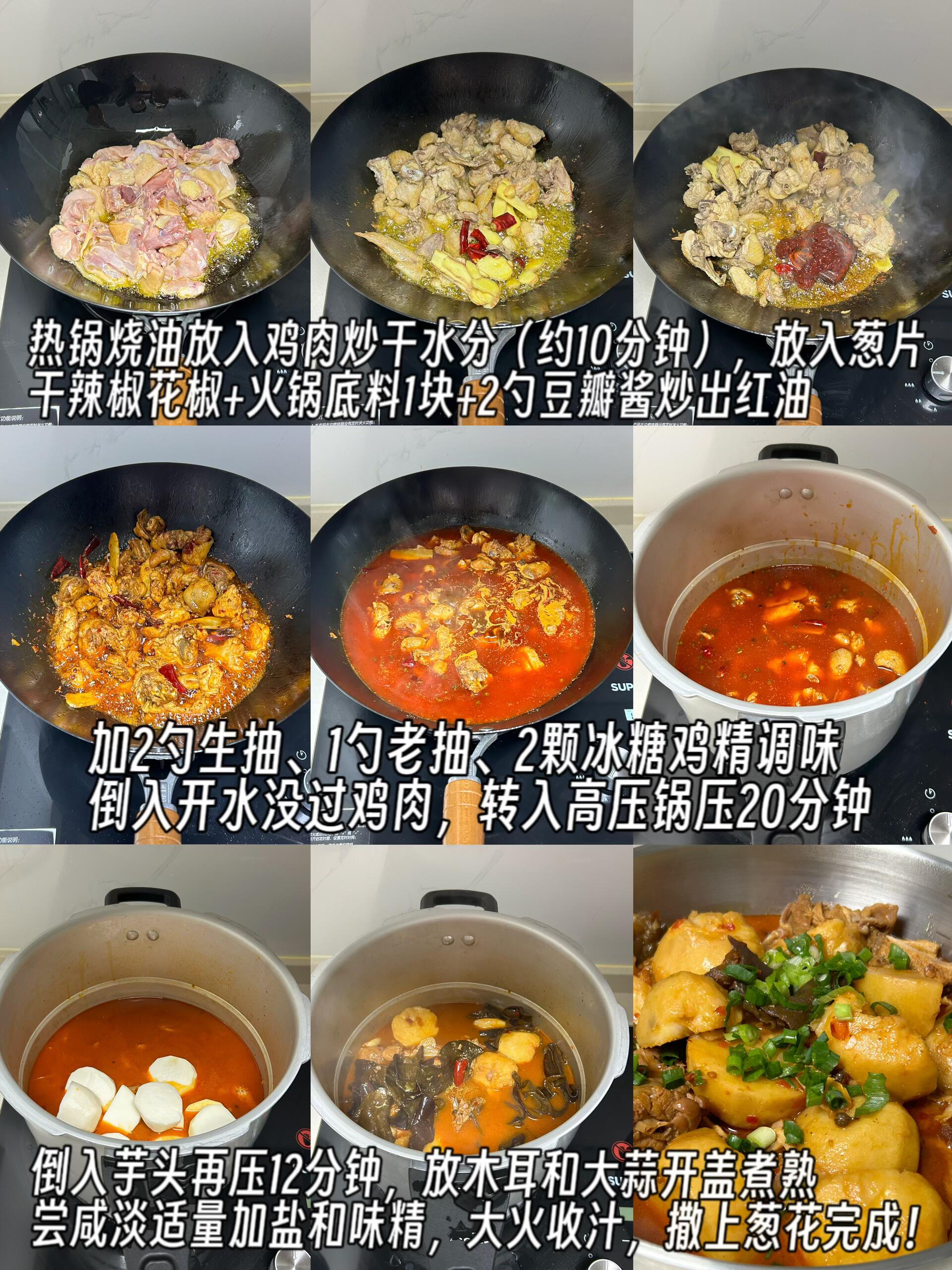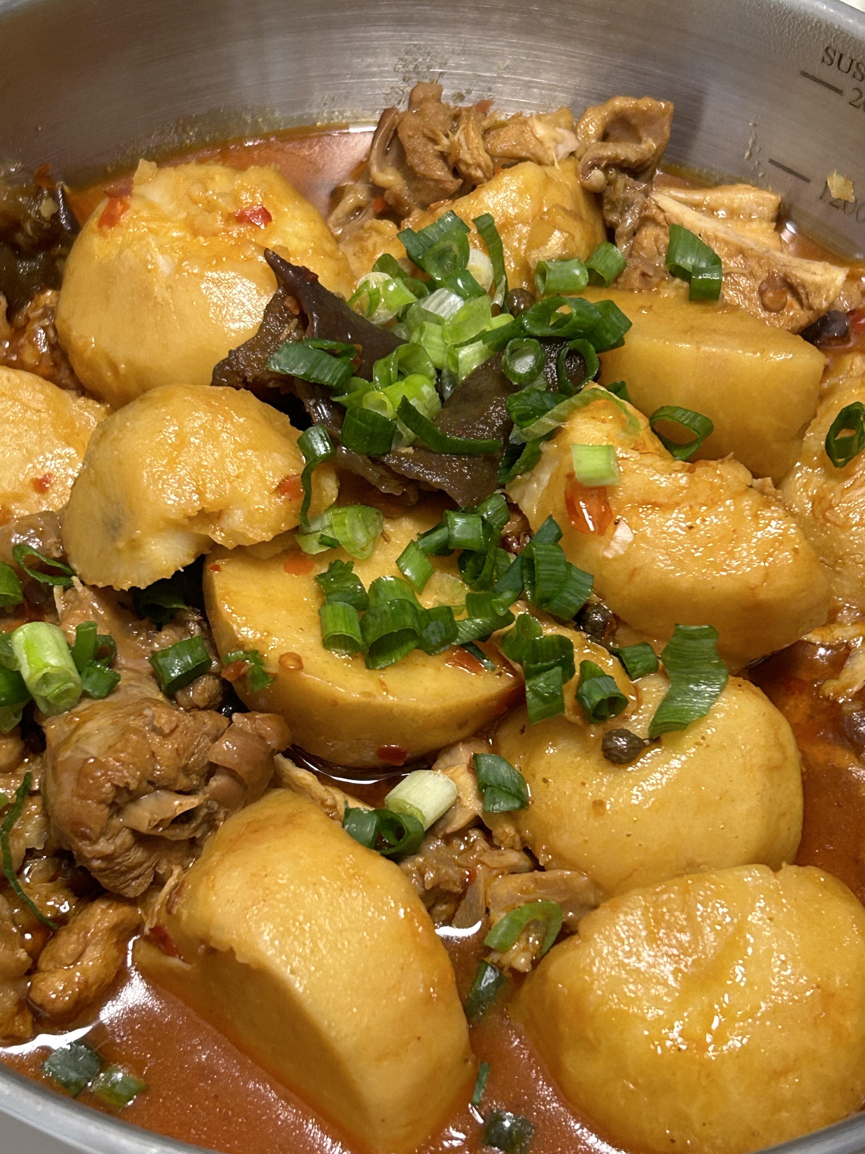4. 加入芋头:鸡肉压好后,倒回炒锅,放入切好的芋头,再压12分钟。芋头在汤汁里炖煮,充分吸收了鸡肉和调料的香味。