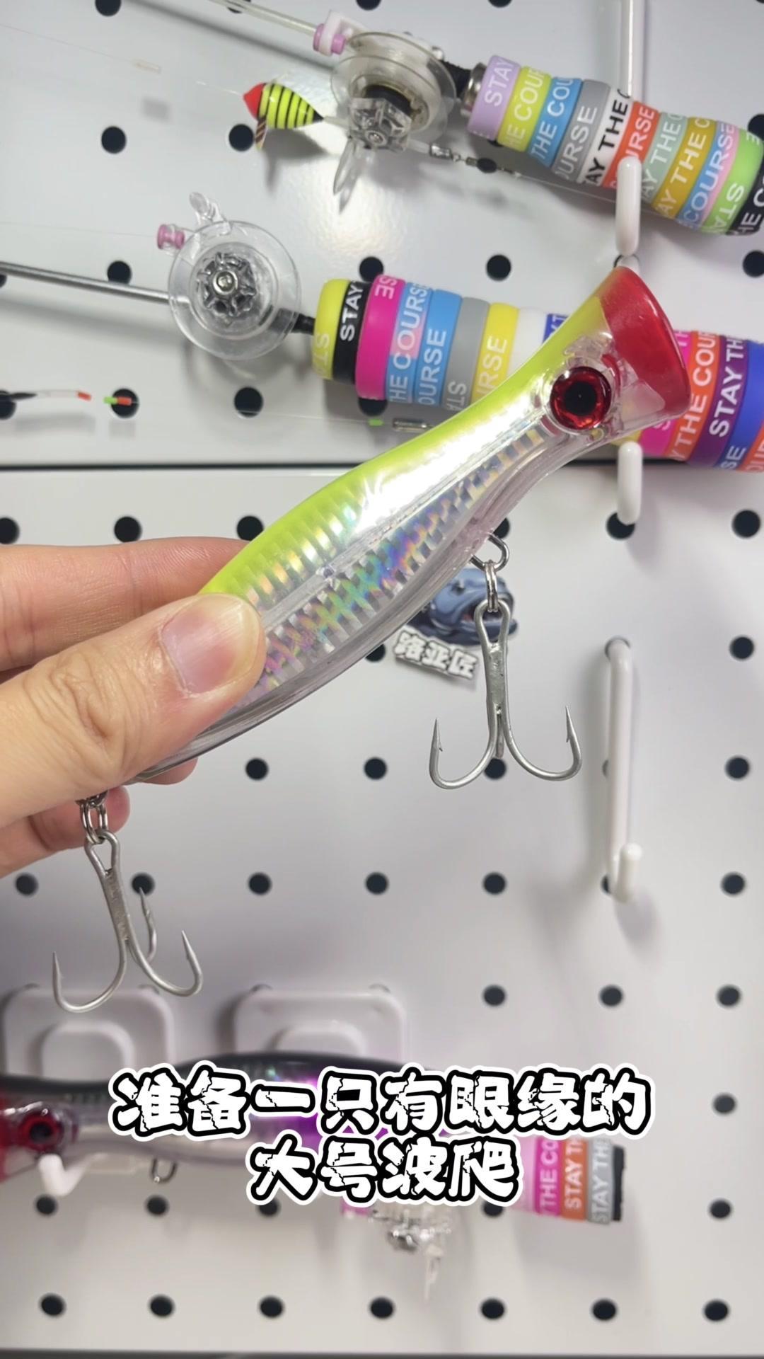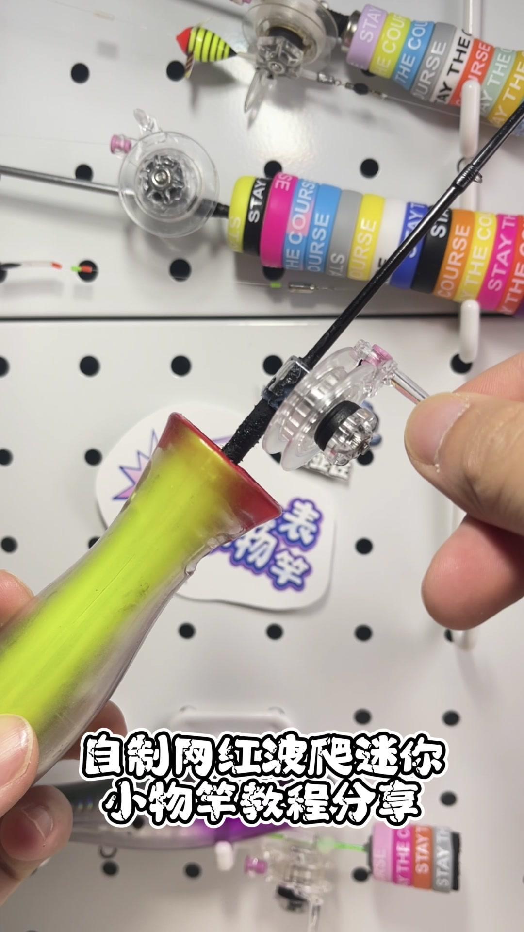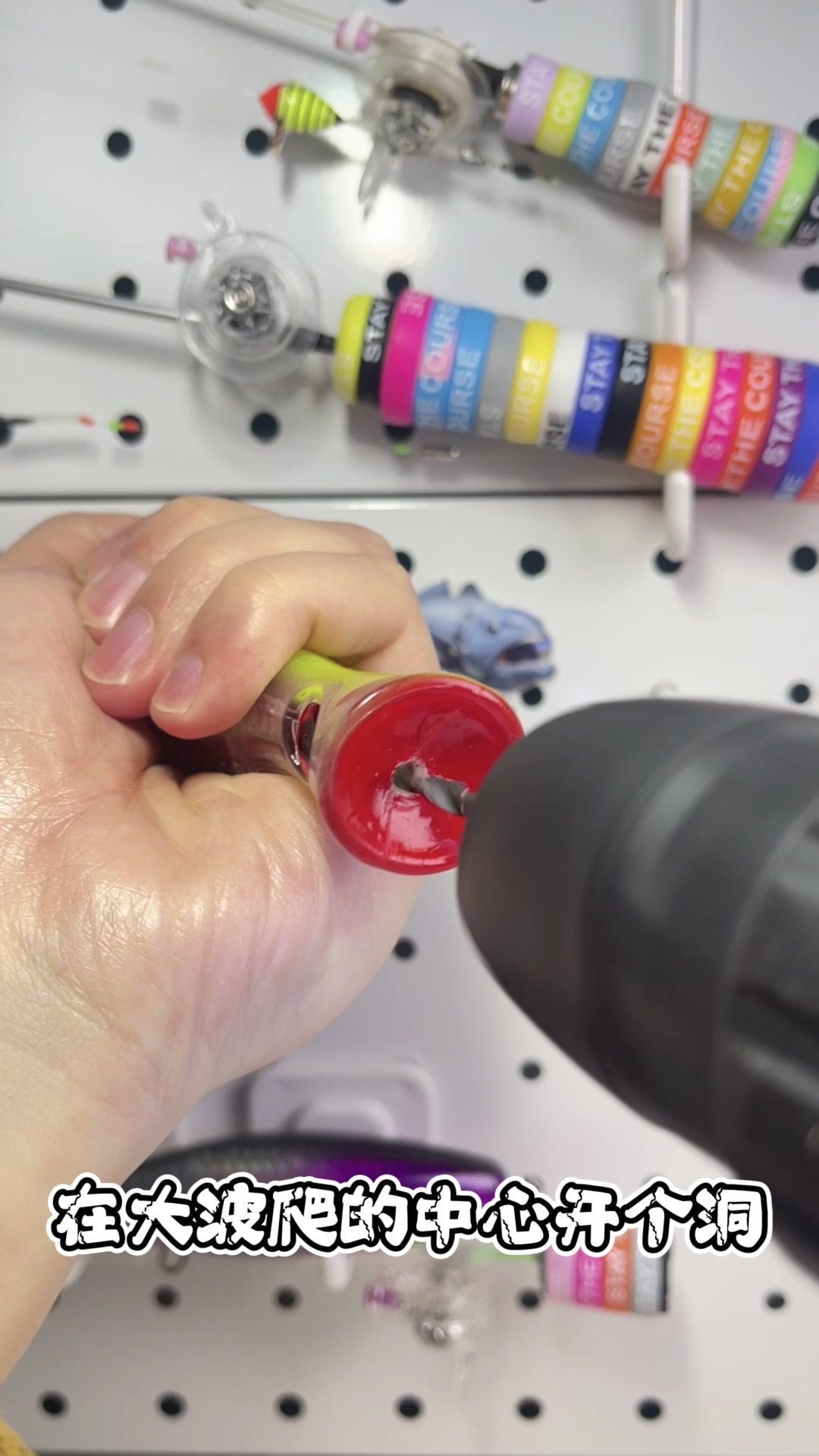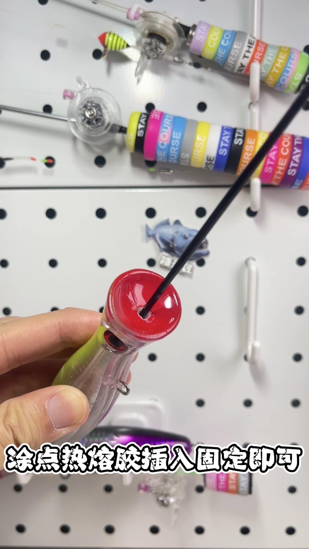 ✨准备:一只有眼缘的大号波爬。 ✨步骤: 1️⃣分别取下两枚三本钩。 2️⃣在大波爬的中心开个洞,将鱼竿穿入小鱼轮内。 3️⃣涂点热熔胶,插入固定即可。