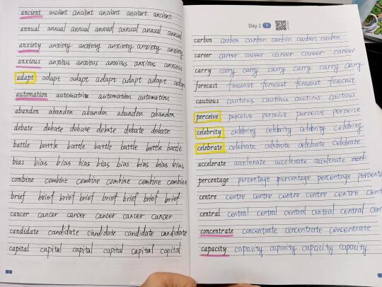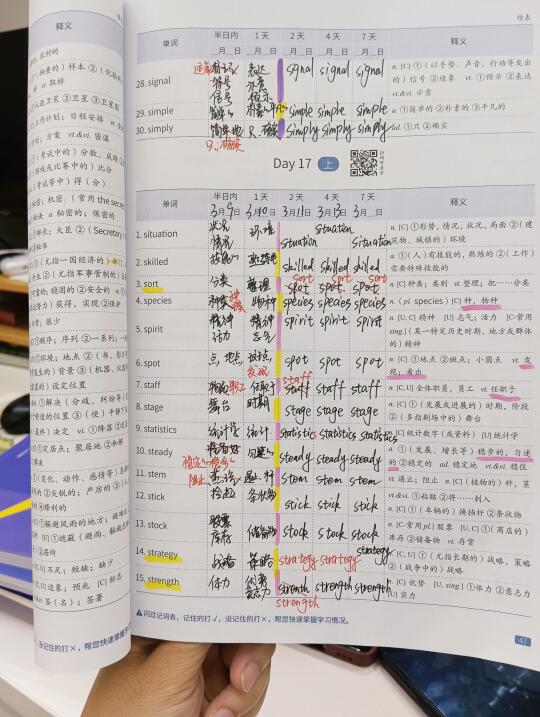 这样背单词!真的快! 🔑 首先,根据自己的复习节奏刷完一轮考研词汇后 就可以开始用图2⃣+3⃣的方法开始复习巩固了! ✅ 根据抗遗忘时间规划打卡表进行背记 (⭕️很棒的一点是汉译英,英译汉可同时进行) ✅ 在抄写本上形成肌肉记忆 抄写完在每行最后还可以默写记住的释义 对照记词本自检! (⭕️排版都是对应设计,方便宝子们快速定位) ✅ 最后通过自测本检验背词效果 这一套下来!!! 真的!单词都可以牢牢刻在脑子里啦! 😎