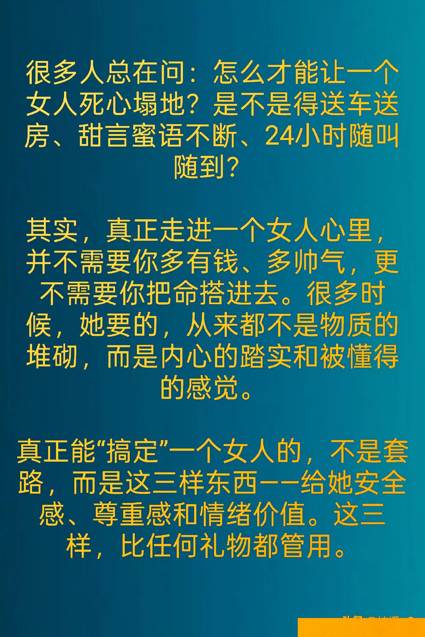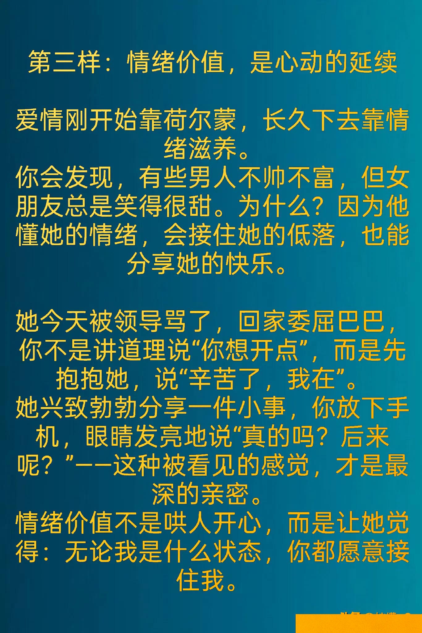 别再琢磨怎么“搞定”一个女人了,爱从来不是套路,而是真心。她想要的,其实很简单。一份是【毫无保留的偏爱】,让她在你的世界里,永远是那个最特别的存在。一份是【能接住她情绪的耐心】,让她所有委屈和雀跃都有回应。最后一份,是【看得见的未来】,让她觉得跟你在一起,每一步都走得很安心。当一个男人给了女人这三样东西,不用你“搞定”,她也会用余生的温柔,坚定地奔向你。