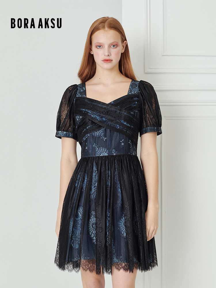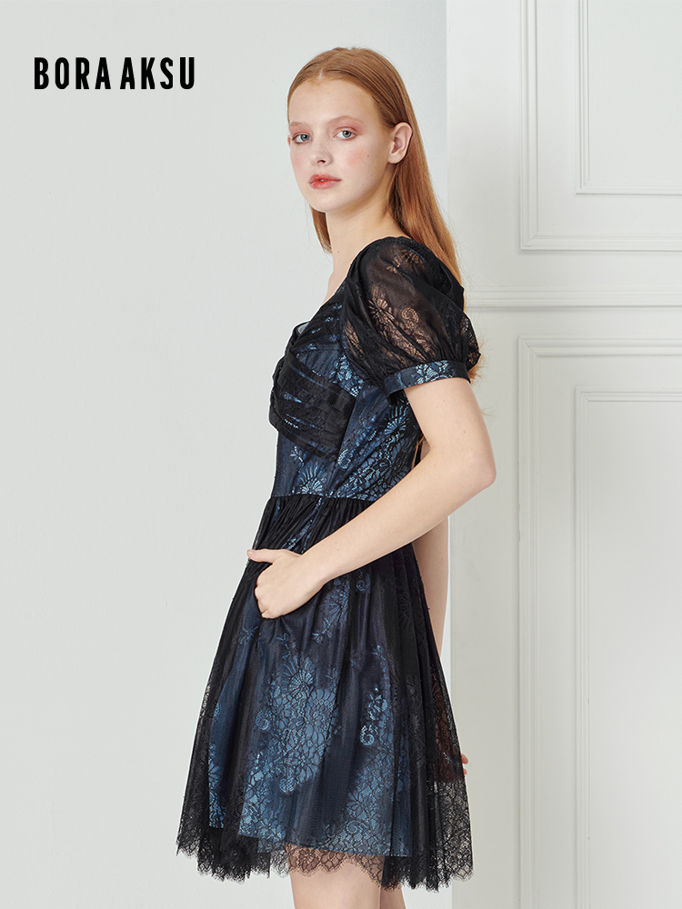 连衣裙采用精致的半透视蕾丝面料制作,搭配雾蓝色调内衬呈现出意料之外的低调奢华姿态,营造唯美朦胧的视觉层次;复古钻石方领结合标志性泡泡袖,打造甜美日常而多样化的轻宫廷风装束。