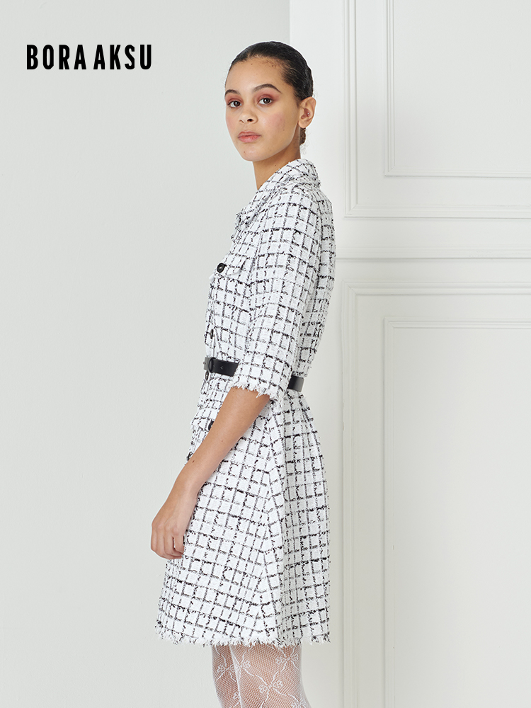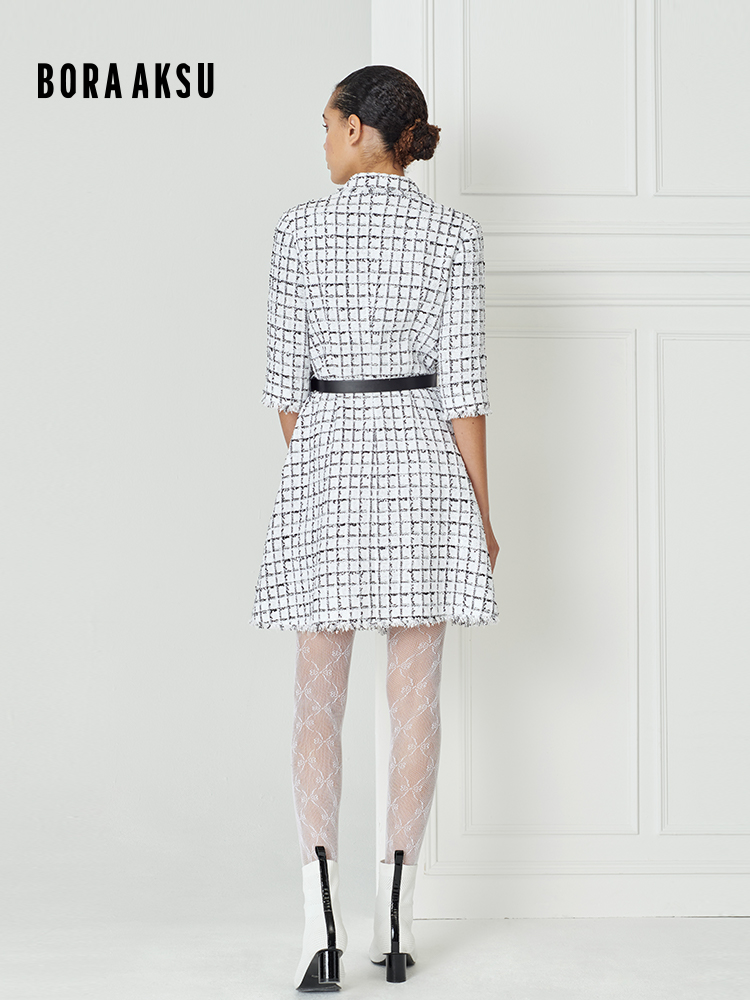 西装连衣裙采用经典黑白格纹粗花呢制成,拉毛须边细节丰富层次感,小翻领演绎知性职场风范,以利落之姿寻迹都市格调。