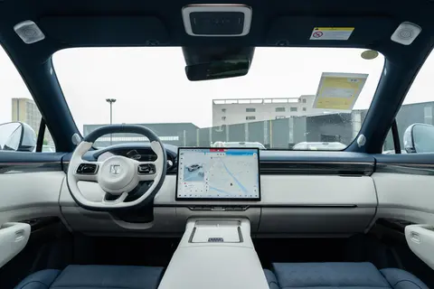 车内配置直接影响日常用车的舒适度,这两款车在这方面各有侧重。极氪 7X 的内饰给人一种简约而不简单的感觉。13.02 英寸的液晶仪表、16 英寸的中控屏和 36.21 英寸的抬头显组成的三联屏,显示效果清晰,操作也很流畅。5G 网络的加持让导航更新和在线音乐播放都很顺畅,基本不会出现卡顿。