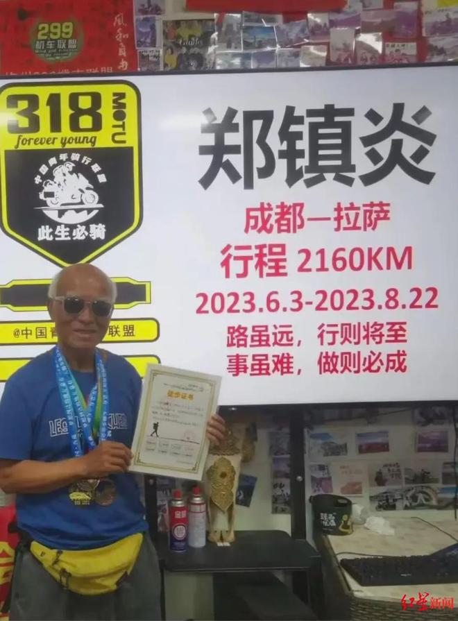 2023年,他从成都出发,沿著有“中国景观大道”之称的G318国道,用时82天,徒步2160公里,抵达拉萨。可以想像,这对年逾古稀者,是多么大的挑战。过程中,他要翻过13座高逾4000米的山峰,其中有两座更高逾5000米,过程中,需要克服高山反应。这次旅程,令郑镇炎终生难忘。