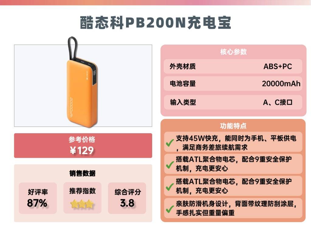 酷态科 PB200N 属于典型的高功率型充电宝,支持最高 55W 双向快充,给手机或笔记本电脑都能快速补电。实测用 100W 充电器自充约 3 小时 20 分能充满,速度较快。20000mAh 容量在多设备充电时十分充裕,尤其适合移动办公或出差场景。