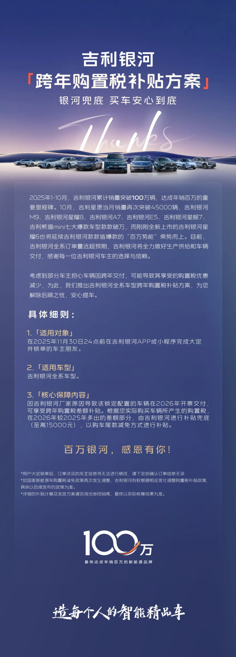 最近,关于银河L7 EM-i的消息不断,关注这个车的朋友也越来越多,我总结了目前的两个核心政策,一是价格来到了11.18万元起,而且还叠加了各项超值权益。二是最近吉利银河考虑到部分车主担心车辆因跨年交付,可能导致其享受的购置税优惠减少,推出了全新的购车新政策,只要在2025年11月30日24点前在吉利银河APP或小程序完成大定并锁单的车主朋友,可享受跨年购置税差额补贴兜底!这样的保障权益,确实让很多人都想冲一波!