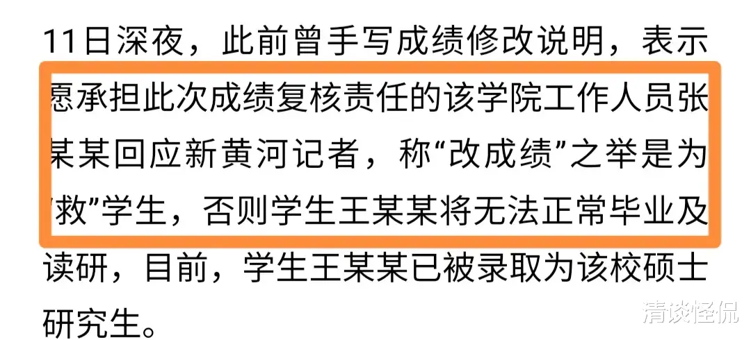 唯独出具修改成绩说明的工作人员张老师,真的是在为爱发电?为了不影响学生前途,自己顶着巨大的风险,也要为学生修改成绩出具手写的“说明”,他是真的不怕担责吗?甚至说有记者采访修改成绩的原因,他也主动站出来,表示这事就是自己干的,所有的责任自己扛。
