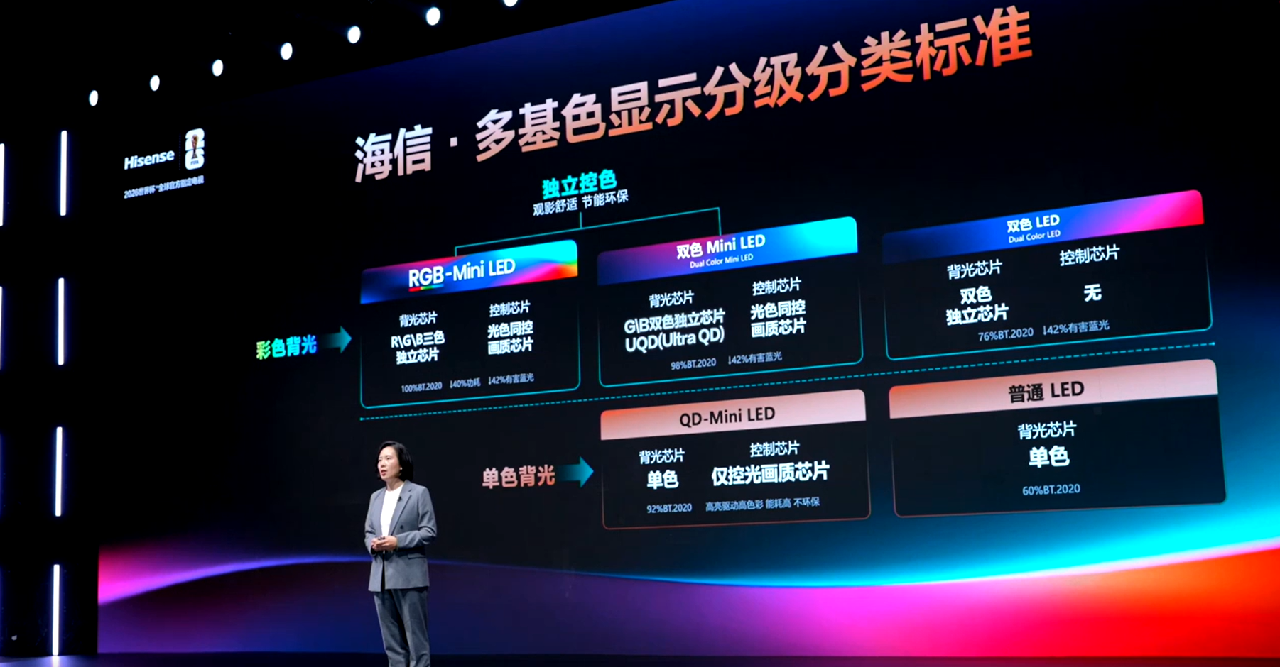RGB-Mini LED技术成为海信此次发布会的核心亮点。与传统Mini LED使用单一白色或蓝色背光不同,海信RGB-Mini LED采用红、绿、蓝三原色背光光源,实现了从“黑白背光”到“彩色背光”的跨越。