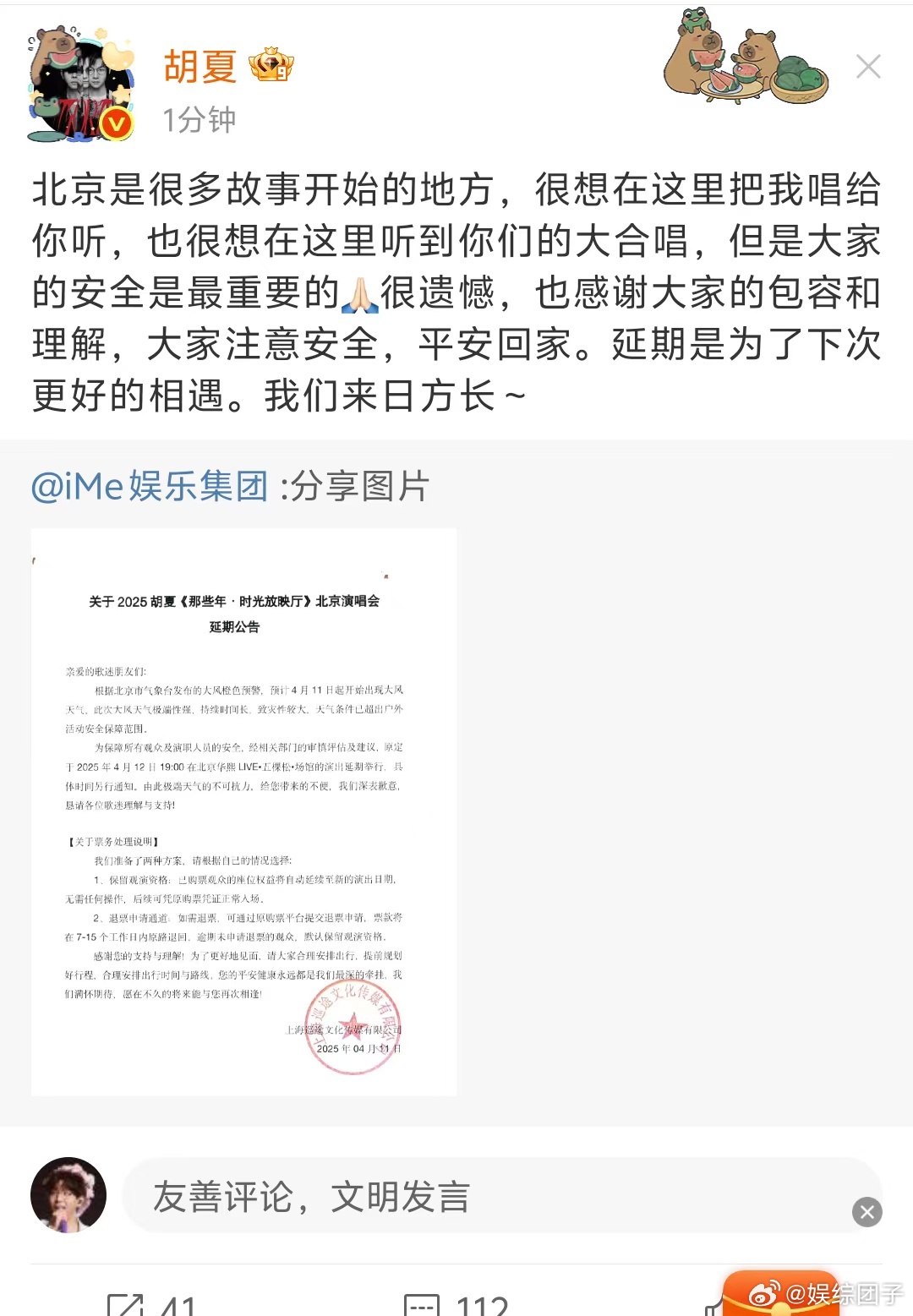 胡夏演唱会已开启退票通道 虽然这次计划泡汤,但我坚信下次一定会和胡夏再相见。他的