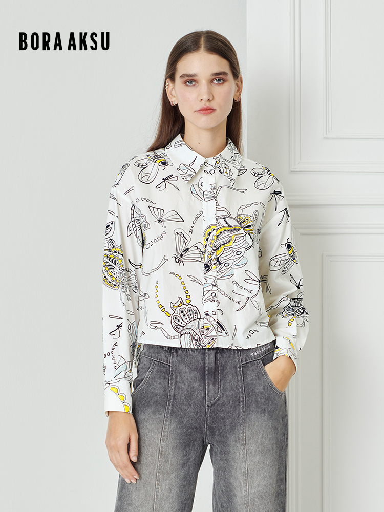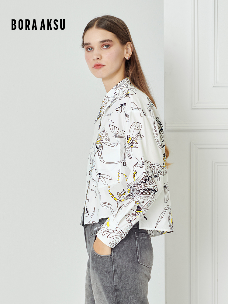 衬衫以白色为基调,通过黑色笔触与明黄色快的昆虫图案点缀打造简约活泼的风格。宽松短款版型融合落肩设计随性时尚且包容度强,推荐搭配同系列牛仔下装,放空心绪触发自由气息。