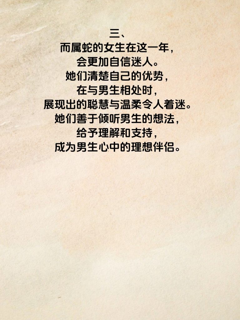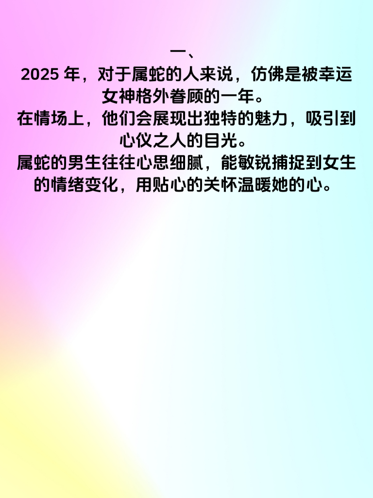 一、2025 年,对于属蛇的人来说,仿佛是被幸运女神格外眷顾的一年。在情场上,他们会展现出独特的魅力,吸引到心仪之人的目光。属蛇的男生往往心思细腻,能敏锐捕捉到女生的情绪变化,用贴心的关怀温暖她的心。 二、他们懂得在适当的时候制造浪漫,或许是一场精心准备的烛光晚餐,或许是一次海边的漫步谈心。这种恰到好处的浪漫,会让女生感受到深深的爱意,从而拉近彼此的距离。 三、而属蛇的女生在这一年,会更加自信迷人。她们清楚自己的优势,在与男生相处时,展现出的聪慧与温柔令人着迷。她们善于倾听男生的想法,给予理解和支持,成为男生心中的理想伴侣。 四、与此同时,2025 年属蛇的人在财运方面也颇为顺遂。他们凭借着自身的智慧和努力,能够抓住不少赚钱的机会,让财库逐渐丰盈。这也为他们的感情生活提供了更坚实的物质基础,让爱情更加稳定美好,好运也随之不断降临。