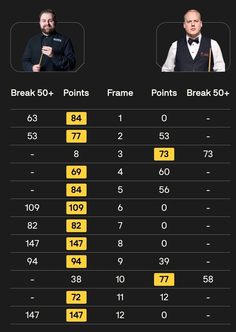 首阶段比赛中,佩奇在第8局打出147,这是他个人生涯首杆147,第二阶段比赛中,佩奇在第12局再度打出147,最终佩奇10-2横扫阿兰-泰勒晋级。