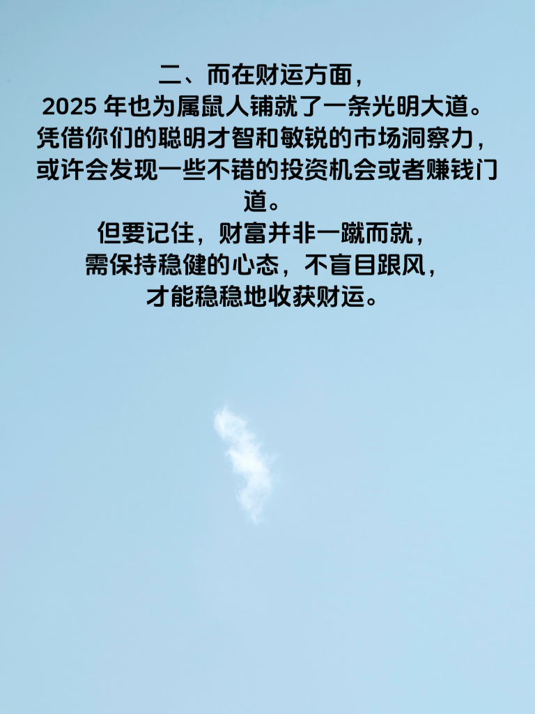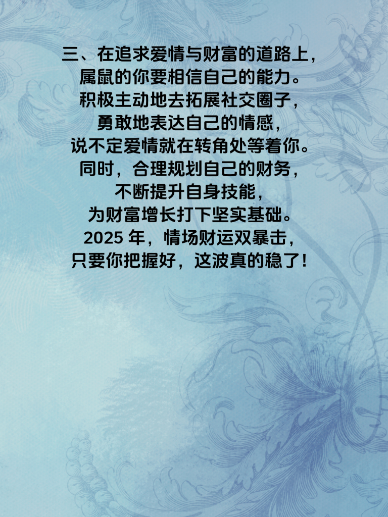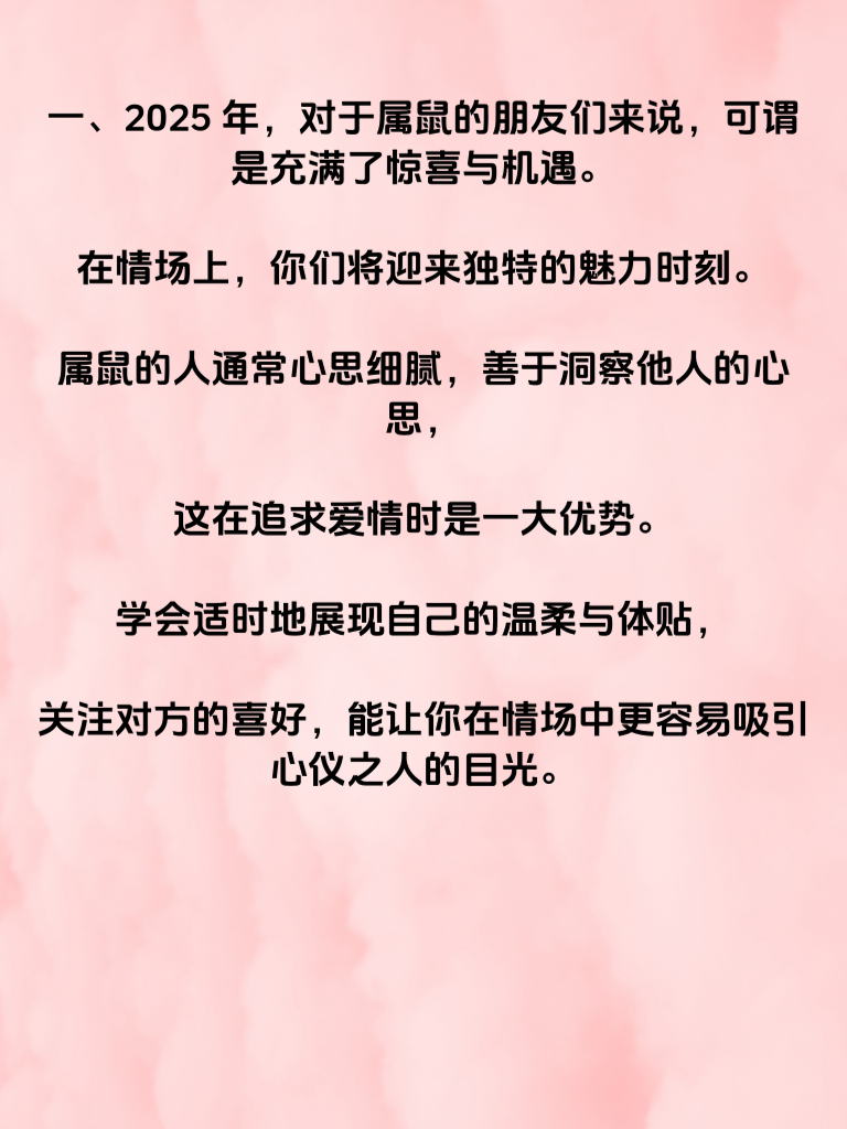 一、2025 年,对于属鼠的朋友们来说,可谓是充满了惊喜与机遇。在情场上,你们将迎来独特的魅力时刻。属鼠的人通常心思细腻,善于洞察他人的心思,这在追求爱情时是一大优势。学会适时地展现自己的温柔与体贴,关注对方的喜好,能让你在情场中更容易吸引心仪之人的目光。 二、而在财运方面,2025 年也为属鼠人铺就了一条光明大道。凭借你们的聪明才智和敏锐的市场洞察力,或许会发现一些不错的投资机会或者赚钱门道。但要记住,财富并非一蹴而就,需保持稳健的心态,不盲目跟风,才能稳稳地收获财运。 三、在追求爱情与财富的道路上,属鼠的你要相信自己的能力。积极主动地去拓展社交圈子,勇敢地表达自己的情感,说不定爱情就在转角处等着你。同时,合理规划自己的财务,不断提升自身技能,为财富增长打下坚实基础。2025 年,情场财运双暴击,只要你把握好,这波真的稳了!