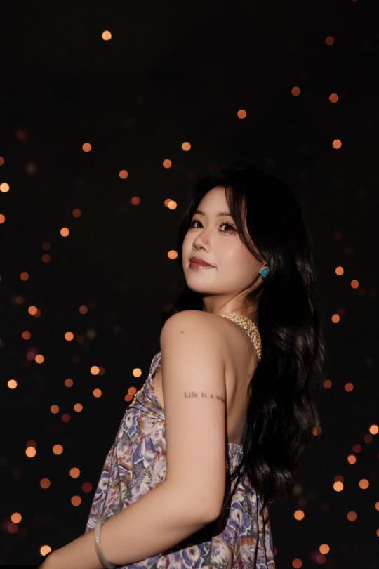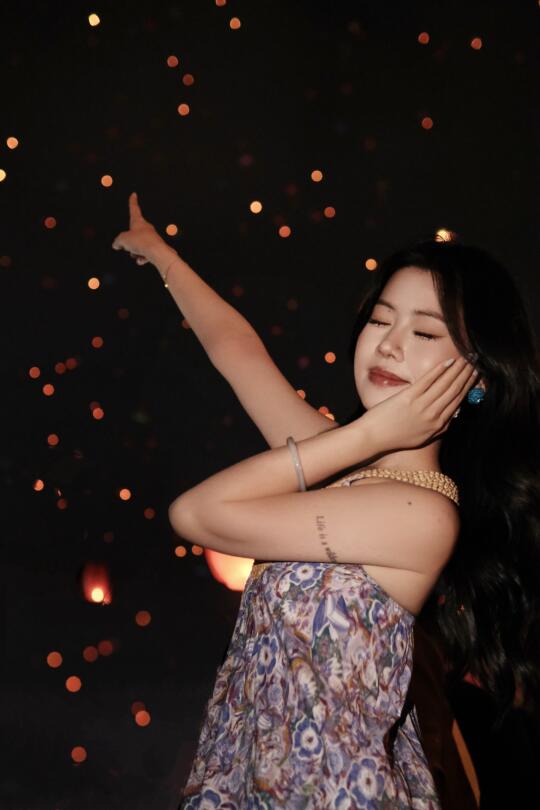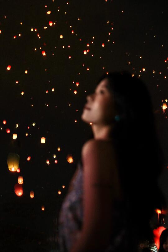 人和天灯各占一半,背后孔明灯作为背景前实后虚,暖黄色的天灯照亮脸部超有氛围感!