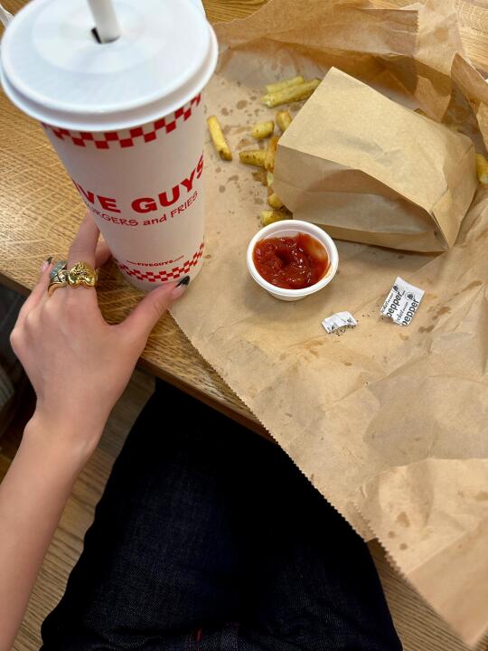 和five guys呼应了色彩穿搭 我对她们家汉堡一般 虽然刘嘉玲认为这是全香港最好吃的汉堡 但我更喜欢five guys的薯条 赢过了麦当当🍟(个人喜爱)