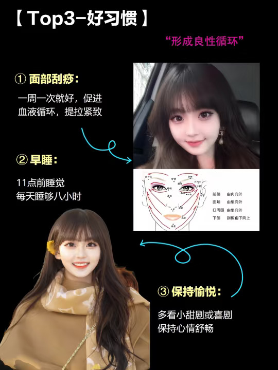 ①面部刮痧:一周一次就好,促进血液循环,提拉紧致