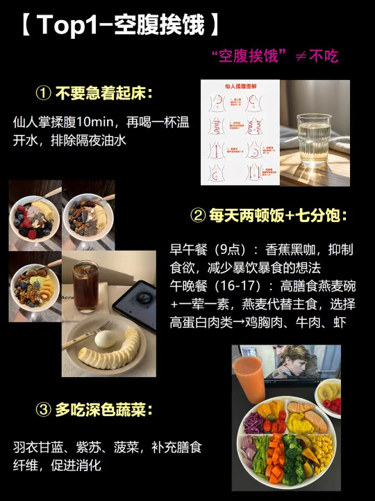 【空腹挨饿】促进代谢→【内调】内部滋养→【好习惯】外部精修