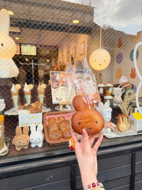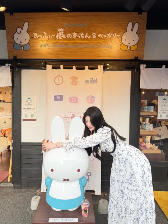 日本川越的米菲兔店,🧑🏻🍳遇到了超级可爱的限定厨房米菲。 还有米菲形状的面包,🫘红豆馅的,很美味😋 米菲兔真的一直是我童年的回忆,记得我小时候的第一个网名就是miffy兔🥹 snidel这条碎花裙好适合春天。