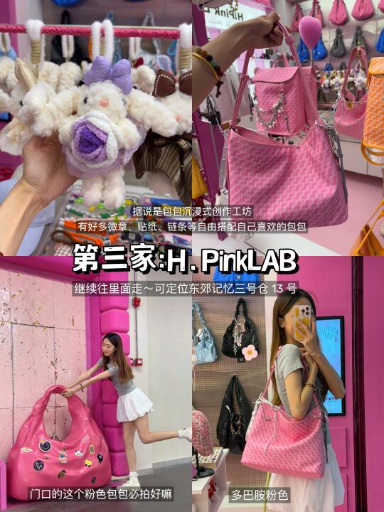 门头粉色超大包包👛一定要来拍照打卡哦~粉色很出片,据说他家是包包沉浸创作工坊,怪不得那么多徽章➕挂件,可以根据喜好随意搭配哦