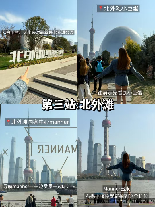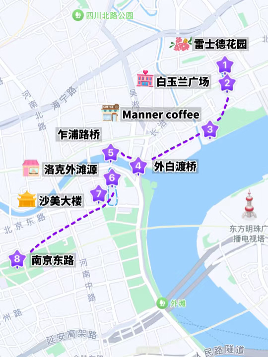 雷士德花园→ 白玉兰→ 北外滩滨江绿地(小巨蛋)→ MANNER咖啡→外白渡桥/乍浦路桥→ 外滩源→沙美大楼→南京东路