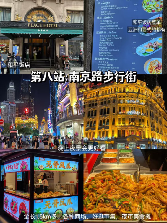 定位和平饭店,一直往下走就是南京路步行街~南京路步行街全长1.5km有各种好逛的商场,市集,夜市美食摊真的很值得慢慢去逛!