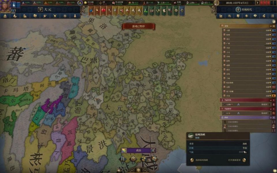 《欧陆风云5》在细节设计方面可以说叹为观止,可探索区域从前作的2500个飙升至超3万个,国家、宗教、文化数量均翻数倍。全3D化地图取代了传统的纸片地形,山脉起伏、河流流动与海岸浪花的细节清晰可见,让“地图涂色”爱好者直呼过瘾。另外还有动态季节系统,让冬雪春樱的交替不仅是视觉景观,更直接影响行军速度与补给效率。