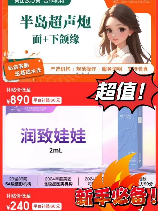 水光大家都知道,补水可少不了它!尤其是经常外出皮肤干燥、粗糙的姐妹们!可以考虑下润致娃娃,主打补水、平复纹路、提拉,皮肤状态轻松搞定!而且现在美团活动也很划算,直接在美团首页搜【医美10923】,单支也才200+。只是沙漠大干皮,用了很多补水护肤品也救不了,但皮肤没有别的问题,冲基础水光就好啦,入门级别的对新手小白很友好!美团上基础水光才几十块钱![赞R]