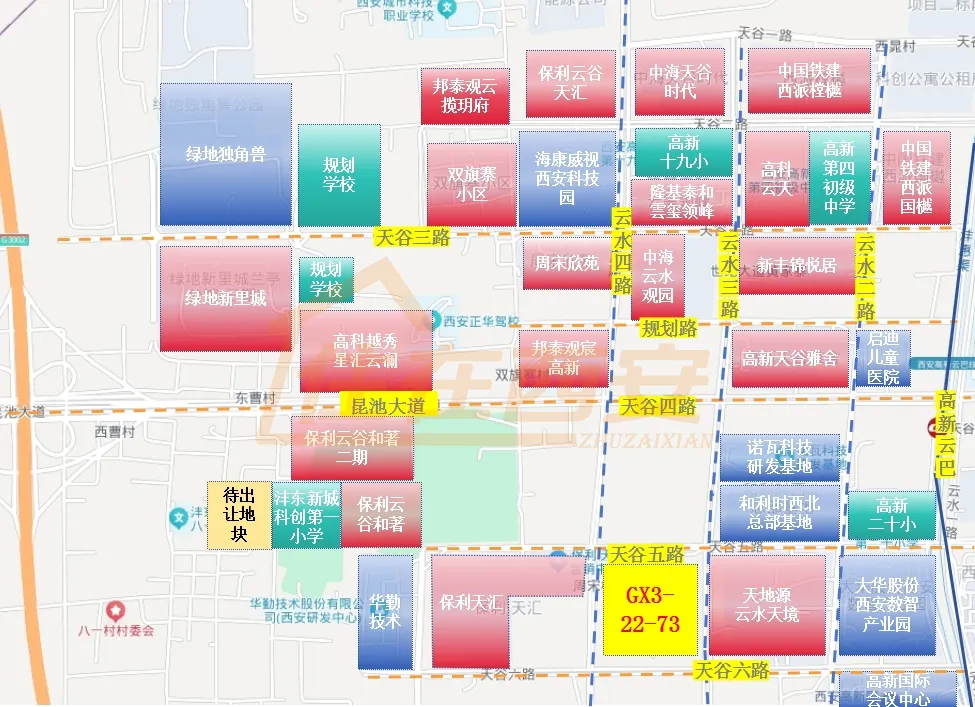 地籍编号GX3-22-73,地块位于高新区天谷六路以北、云水三路以西,净用地面积125.377亩,住宅用地。