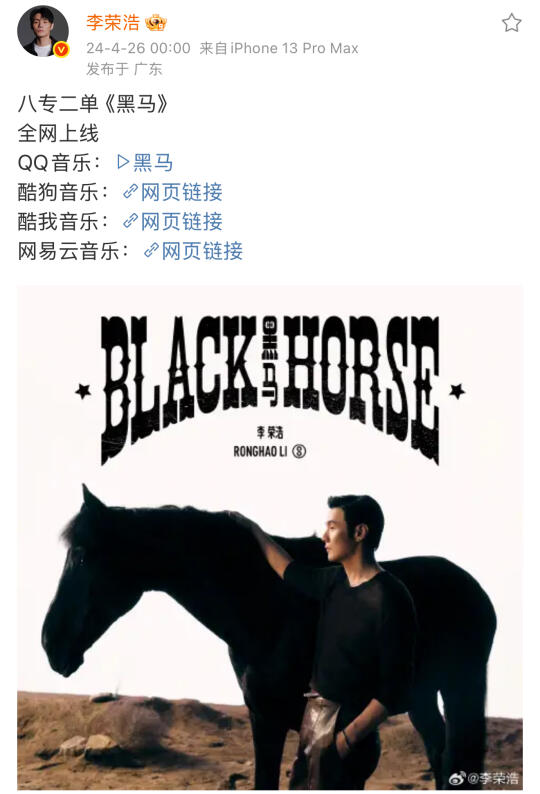 💙【2019.4.26】“一个人类没有了音乐,就是人的灵魂上没有了依靠”原创唱作人李荣浩先生就这样写了一首又一首,走了一年又一年 💙【2020.4.26】嗯?哪里有弹舌?看看哪位小伙伴没有跟上李老师的网速咯 💙【2024.4.26】八专第二首单曲《黑马》正式在全平台上线🎉,耳机里的旋律不知不觉就听了一年 💙【2024.4.26】纵横四海·龙年 官宣暑假期间重返苏州,今年暑假,黑马大乐园将来到上海,期待江浙沪朋友再次光临~