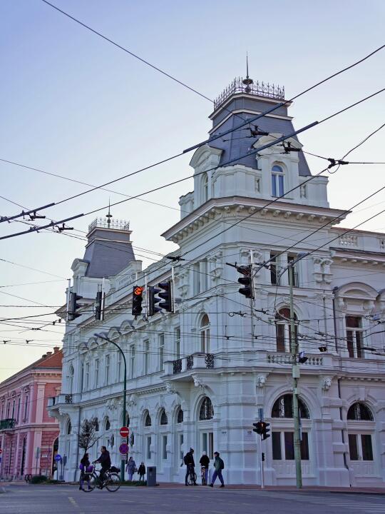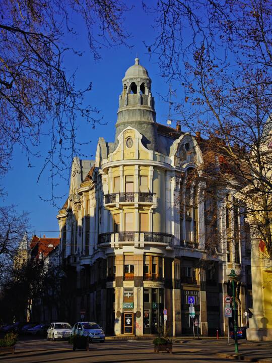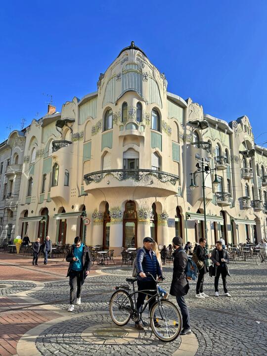 一座淡蓝色的新艺术风格建筑,线条流畅,梦幻而优雅,是赛格德的隐藏版美学地标。