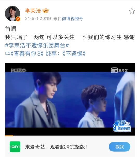 💙【2021.5.1】青春有你的舞台上,当熟悉的前奏与年轻的声音重叠,导师合作舞台上的微笑里藏着时光的重量。那些关于《不遗憾》的诠释,在这一刻完成了一场跨越时空的接力。
