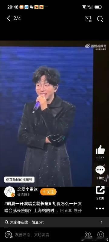 胡夏一开演唱会就长痘 被胡夏的痘痘可爱到!这波“长痘式营业”太反差萌!但只要他开口唱歌,穿透灵魂的声线搭配华丽舞美,瞬间把压力化作惊艳舞台,直接拿捏观众心!