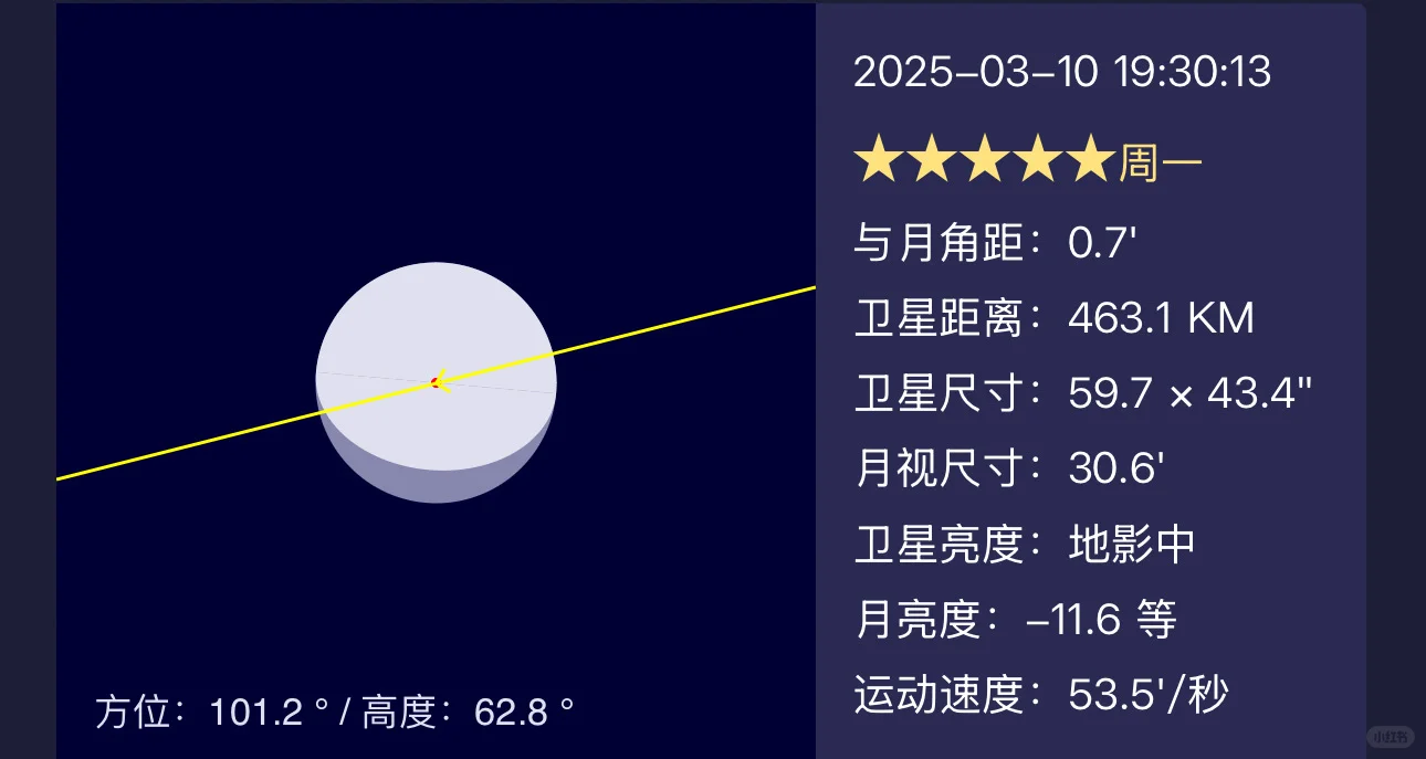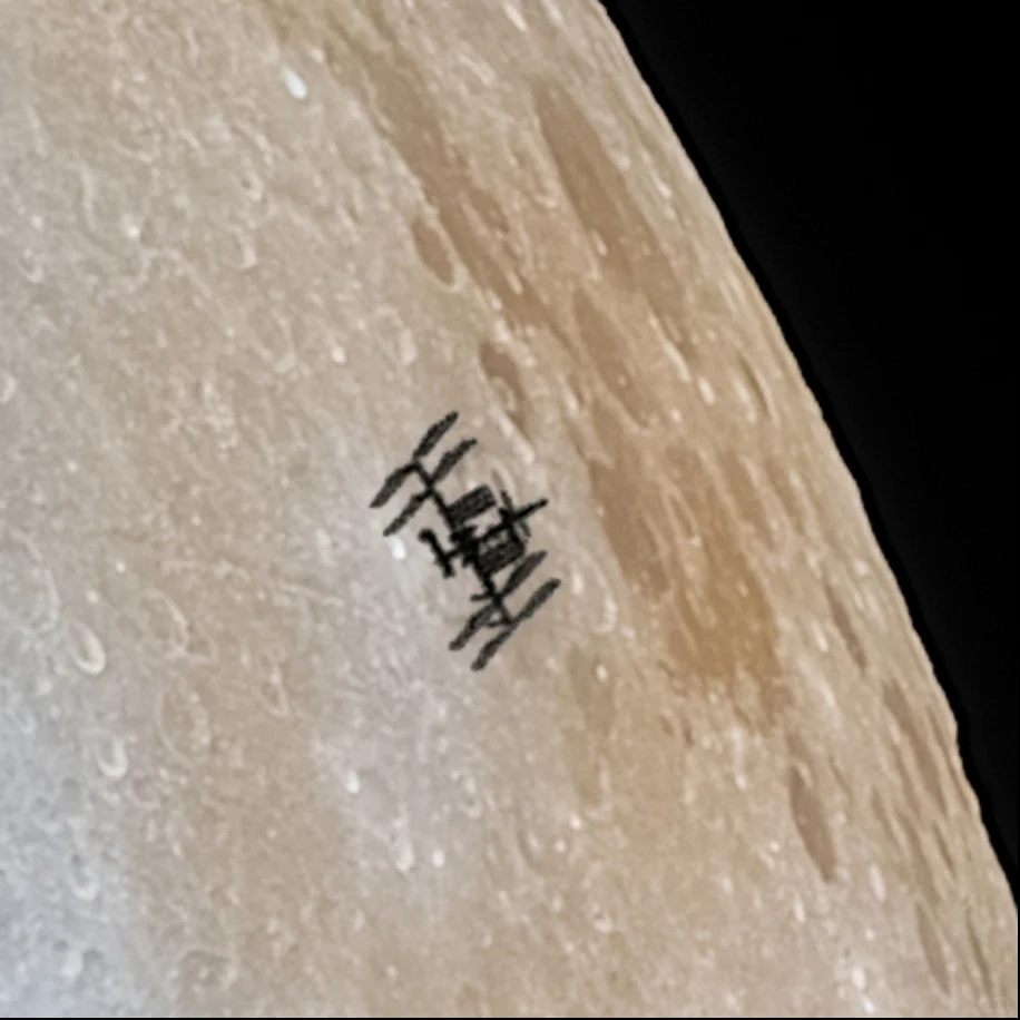 2025.03.10. 19:30:13, 国际空间站凌月,精准捕捉,结构清晰,榨干102mm口径,今年的ISS凌月毕业了。运气特别好,拍完就起云了。