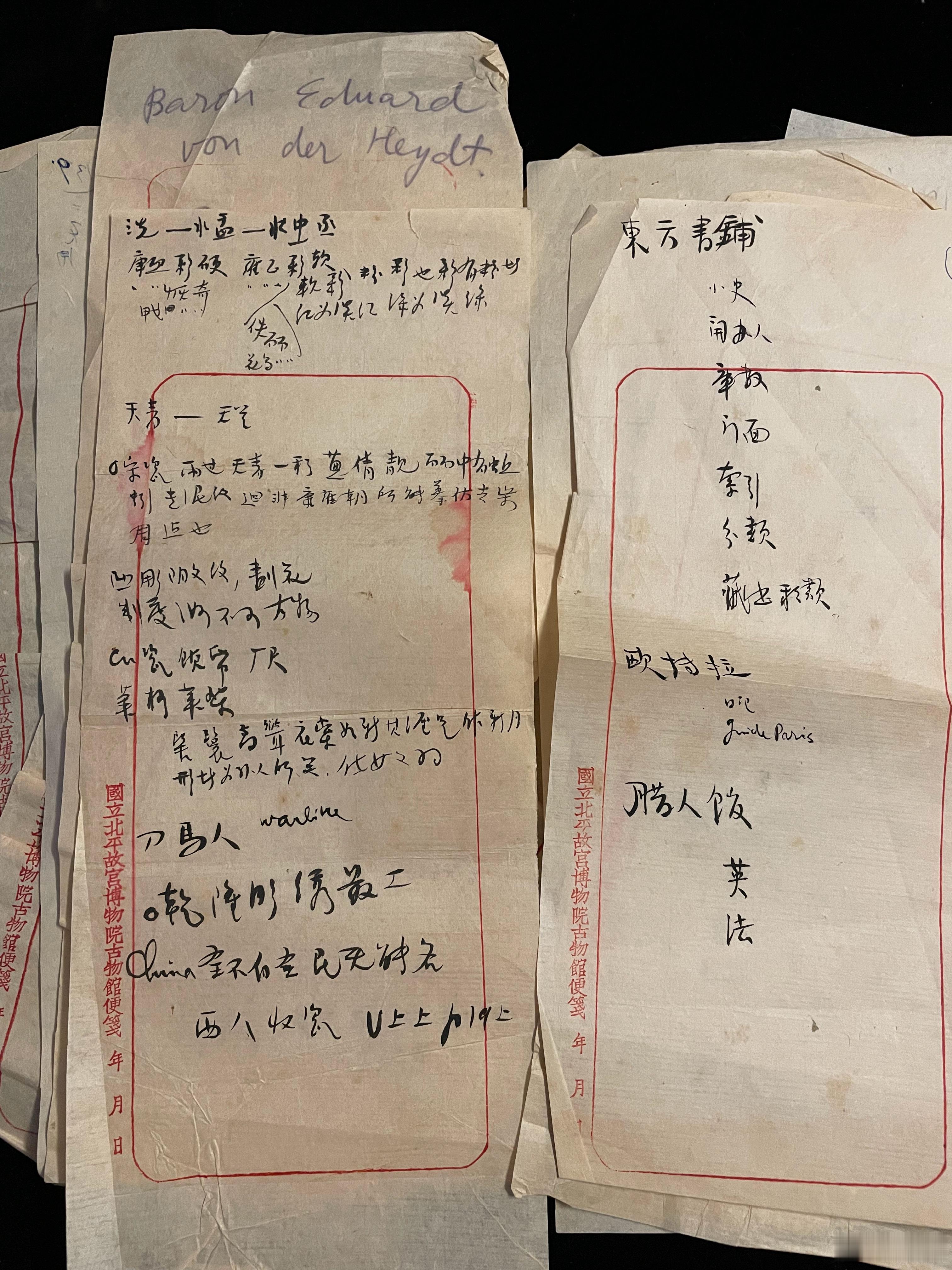 上个月,一批傅振伦先生所藏笔记、藏书和文件散佚孔网,有幸拾得其中一部分(图2、4、6、8)。零散的笔记中包含了傅先生参与伦敦和莫斯科艺展时的经历,其中不少未见于其所著游记和晚年时整理的《七十年所见所闻》等书。他在巴黎的记载尤为鲜活,不仅有和王重民、于道泉等旅欧学人及欧洲汉学家的交游,更有在红磨坊和蒙马特等地的放松参观。从笔记还原的视角来看,在35至36年的英伦及欧陆之行中,傅先生除了护送国宝往返外,还参观了欧洲的主要博物馆,写下了对展陈的感受和心得。在归国后,他细致梳理了参观所获,将其运用于自己日后的博物馆管理工作之中。笔记中新见内容是他记下了伦敦可以制作展柜的店家信息。除此之外,他对欧美公私所藏中国文物进行了近可能的摸底和梳理。他对卢芹斋所盗售文物尤为关注,在伦敦和巴黎期间数度造访卢所办展览和寓所,并详细记录了所见文物,有些可能未见于卢所出版的图录。
