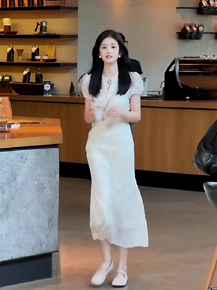 法式白色收腰a字波点连衣裙温柔风气质鱼尾长裙初恋清纯奶甜裙子