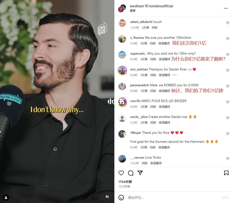 1亿买赖斯赚了,枪迷涌入西汉姆ins:要加钱
